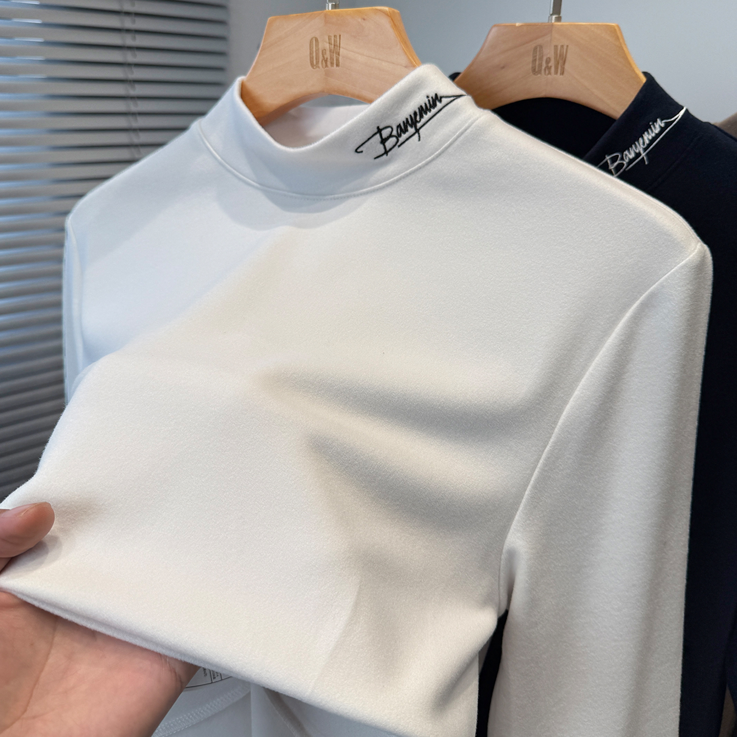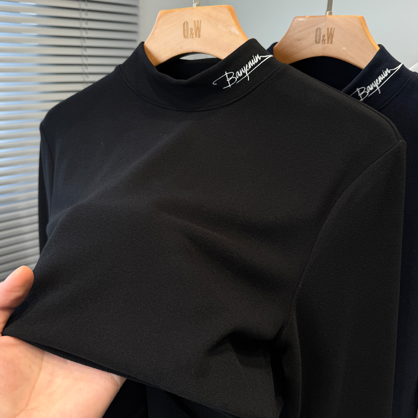 内搭衣服 t恤男长袖 字母刺绣磨毛双面德绒打底衫 男半高领青年修身