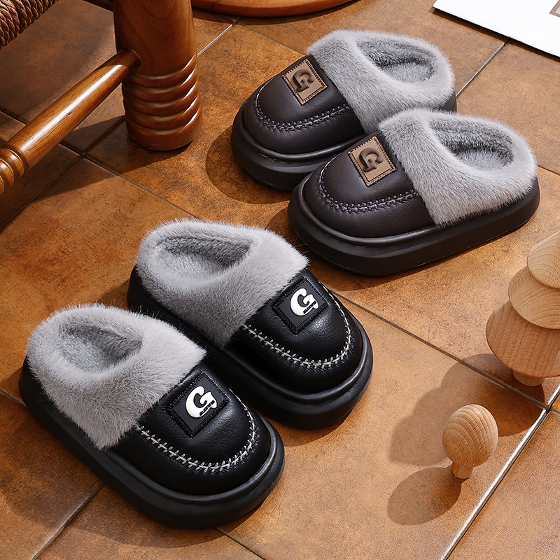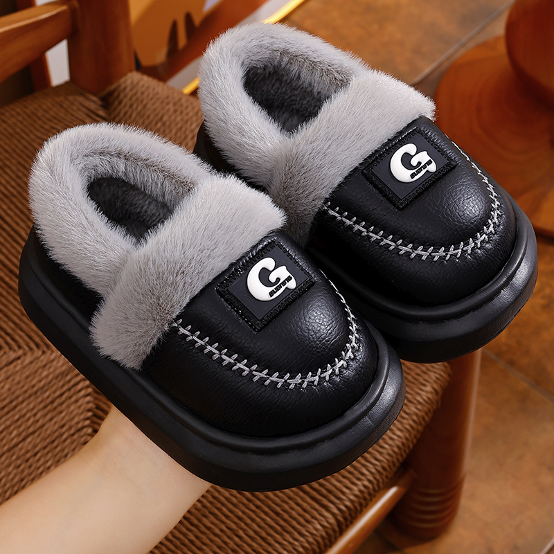 防滑男女童软底 包跟成人保暖加绒加厚pu皮居家棉鞋 冬季 亲子棉拖鞋