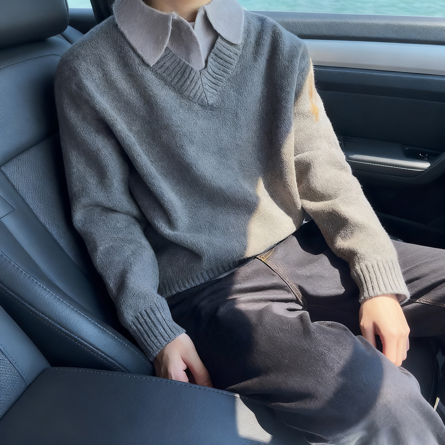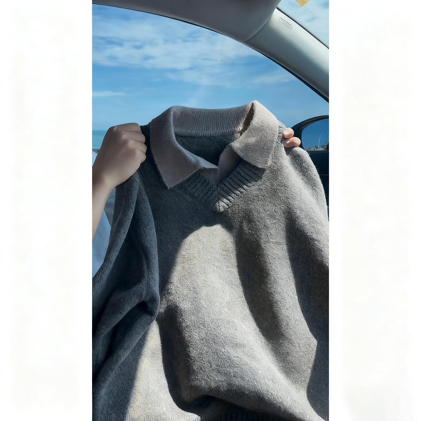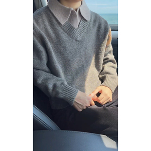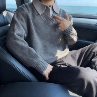 假两件拼接v领毛衣男秋冬韩系老钱风穿搭针织衫 痞帅翻领外套 美式