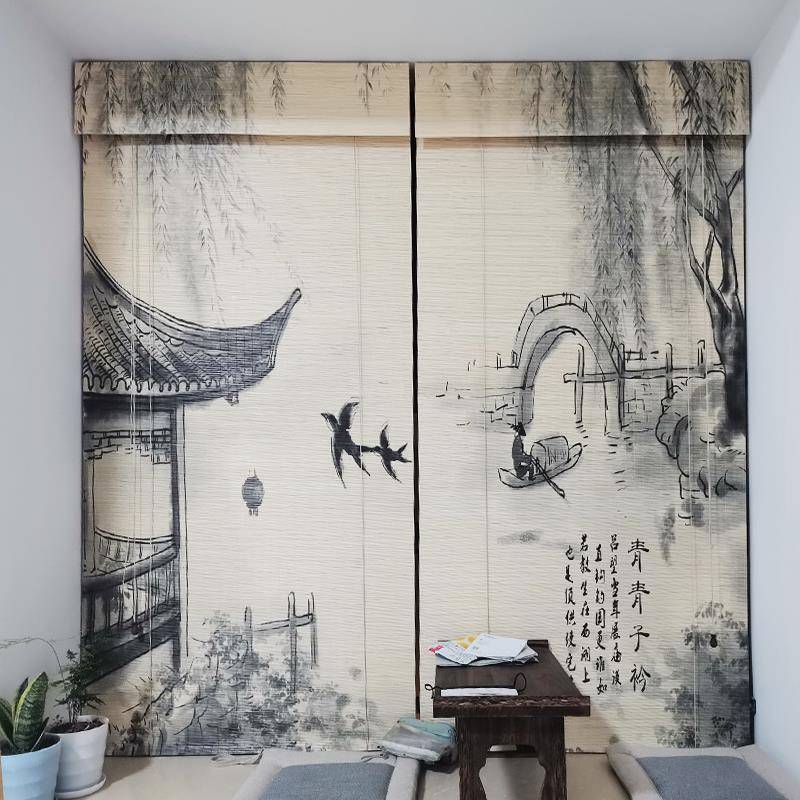 饰挂画遮阳隔断门帘 修窗帘茶室装 定制竹帘卷帘中式 复古印花卷帘装