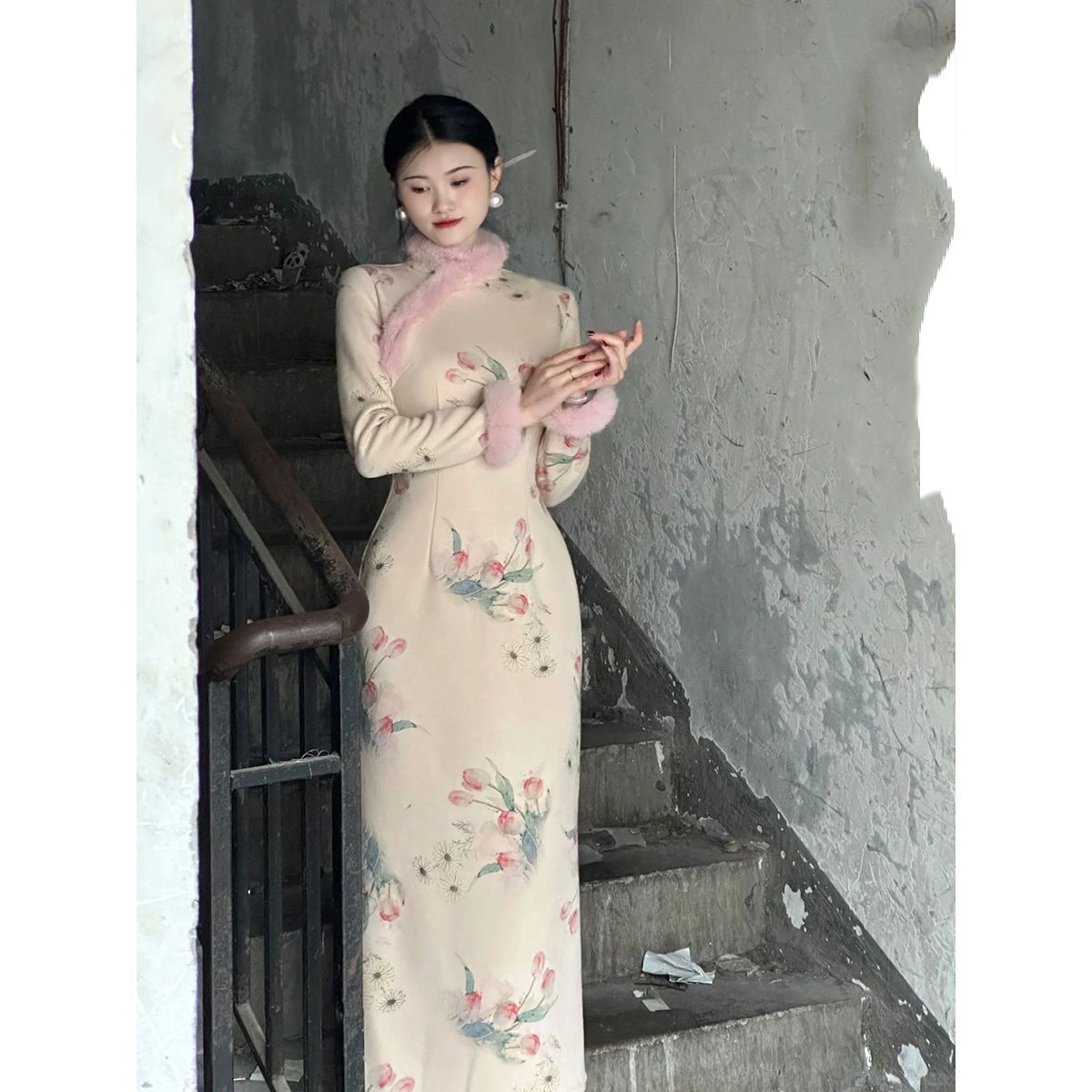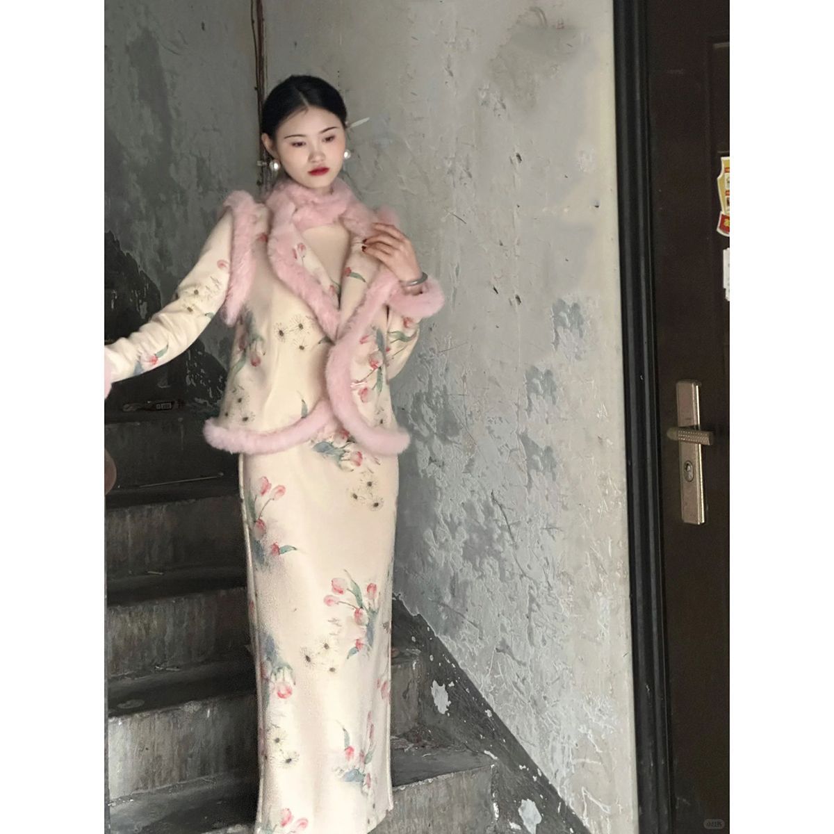 2025年新款 旗袍裙马甲套装 秋冬国风 显白乖巧毛毛长袖 粉香玉新中式