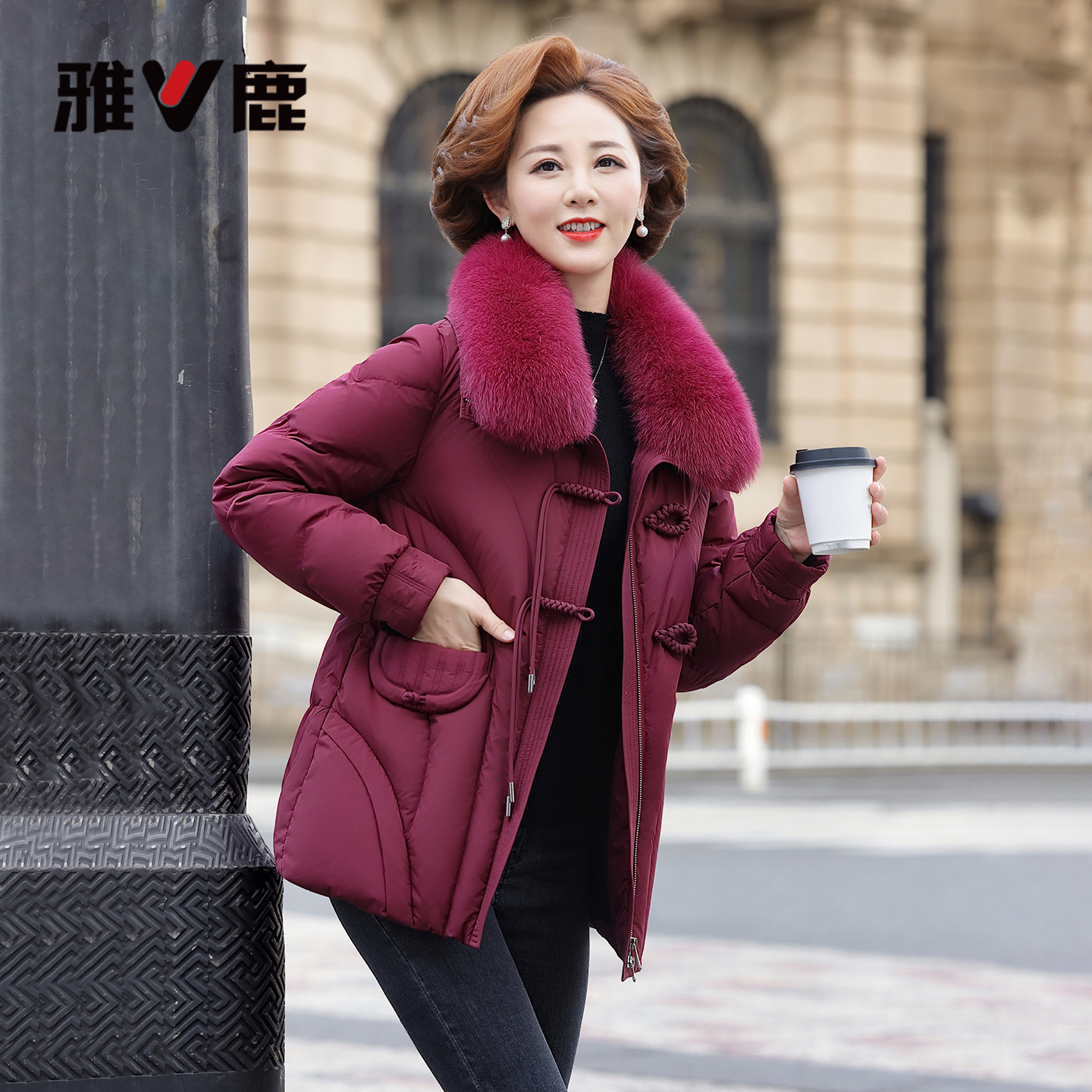 雅鹿妈妈狐狸大毛领羽绒服女士2025冬新款 保暖外套 中老年休闲时尚