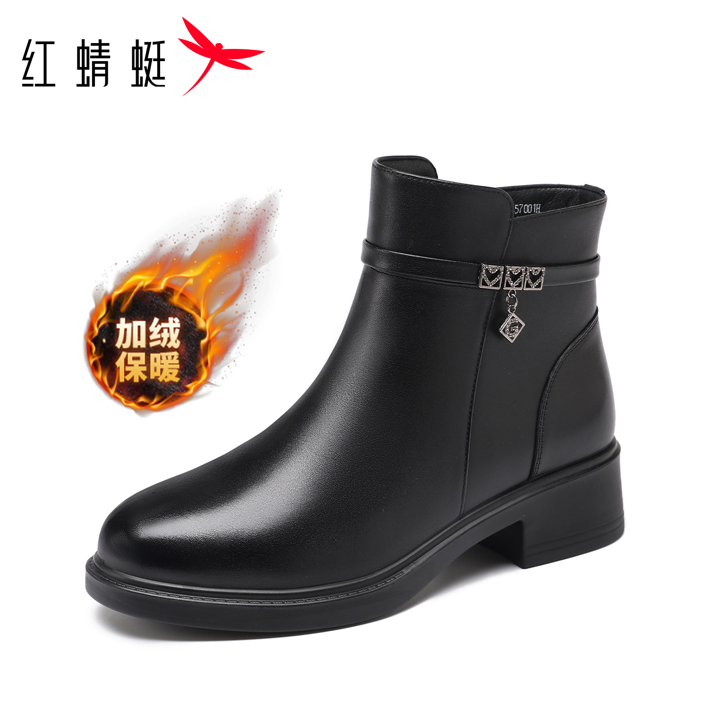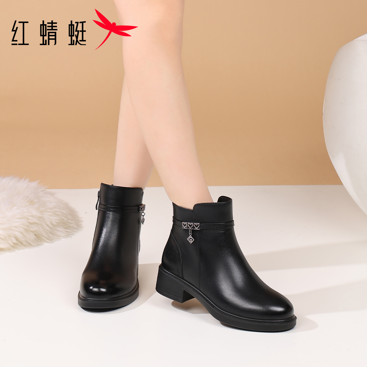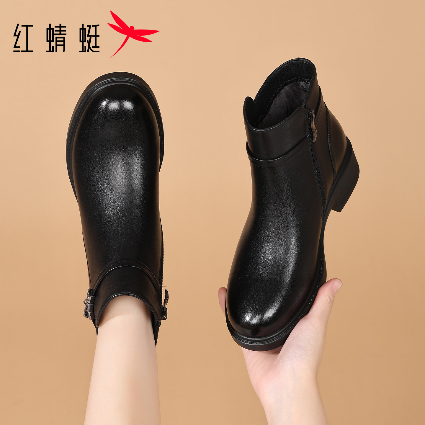 加绒保暖粗跟妈妈靴子真皮棉鞋 红蜻蜓冬季 冬季 2025新款 小短靴女款