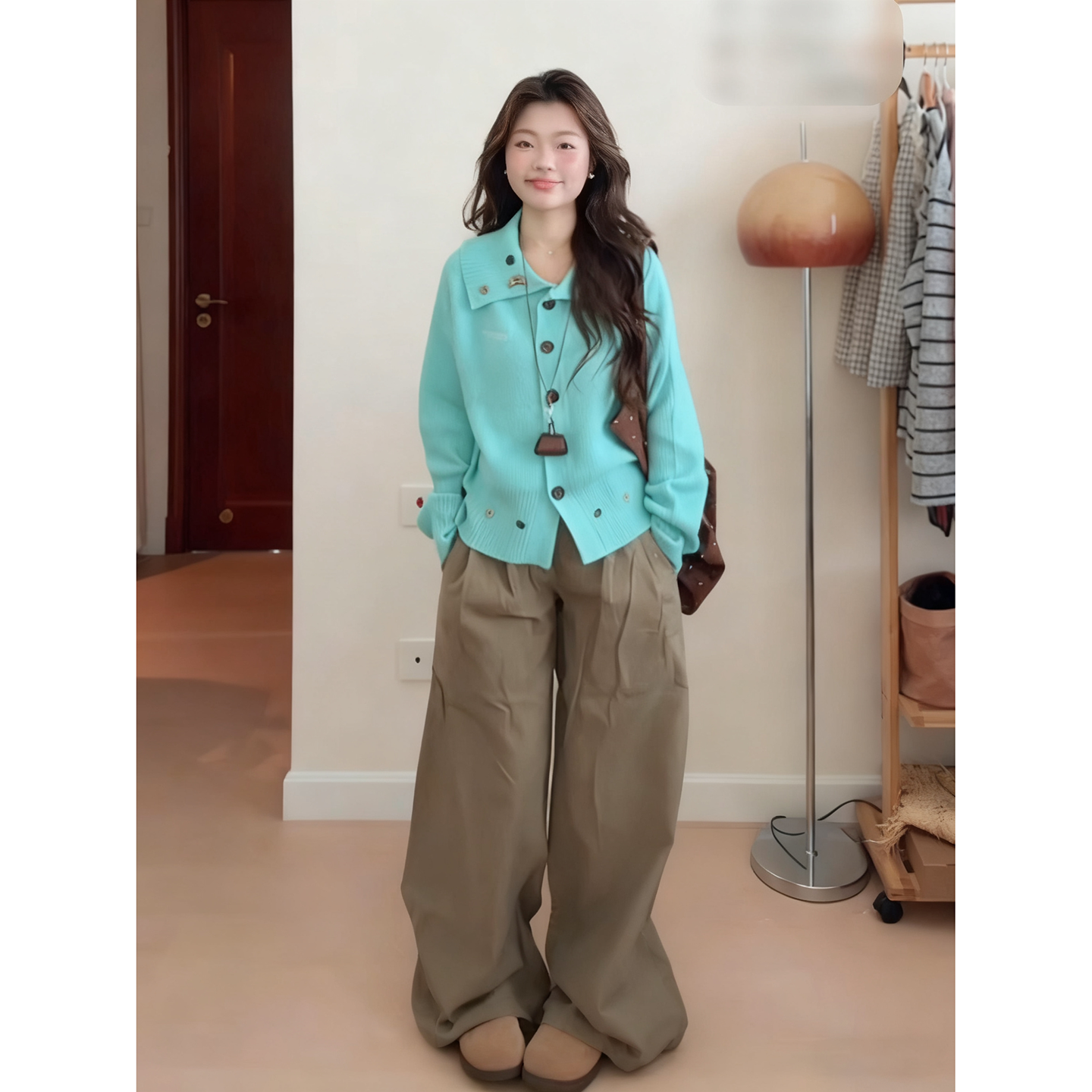 软糯慵懒风短款 浅蓝长袖 新款 毛衣女秋冬季 针织上衣外套 大翻领开衫