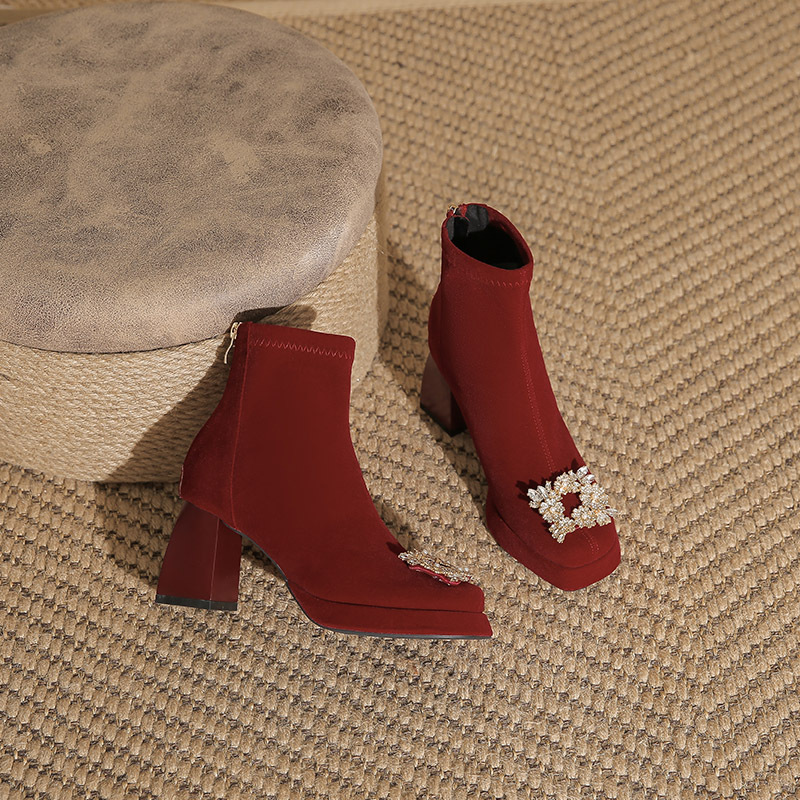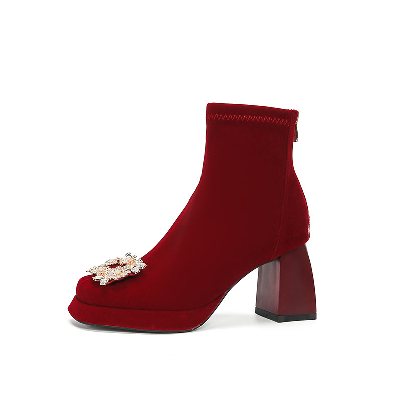 绒面红色粗跟短靴女2025新款 秋冬婚靴小个子方头厚底靴子 高跟婚鞋