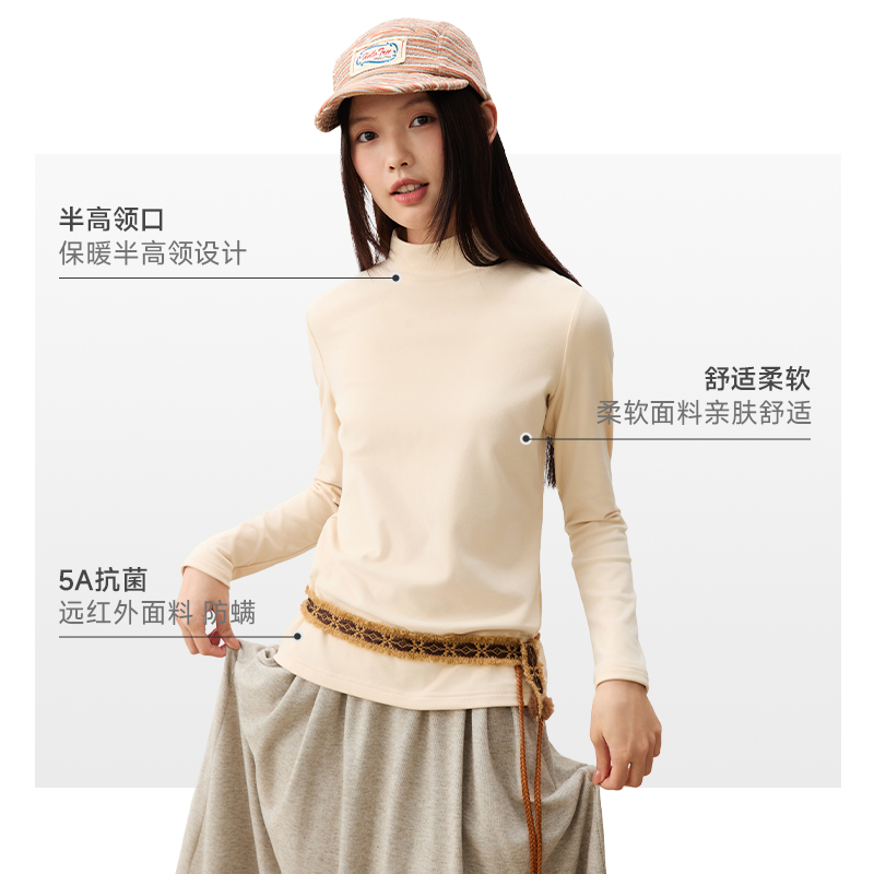 长袖 ZH回力半高领薄绒打底衫 磨毛内搭修身 秋冬季 t恤 女2025新款