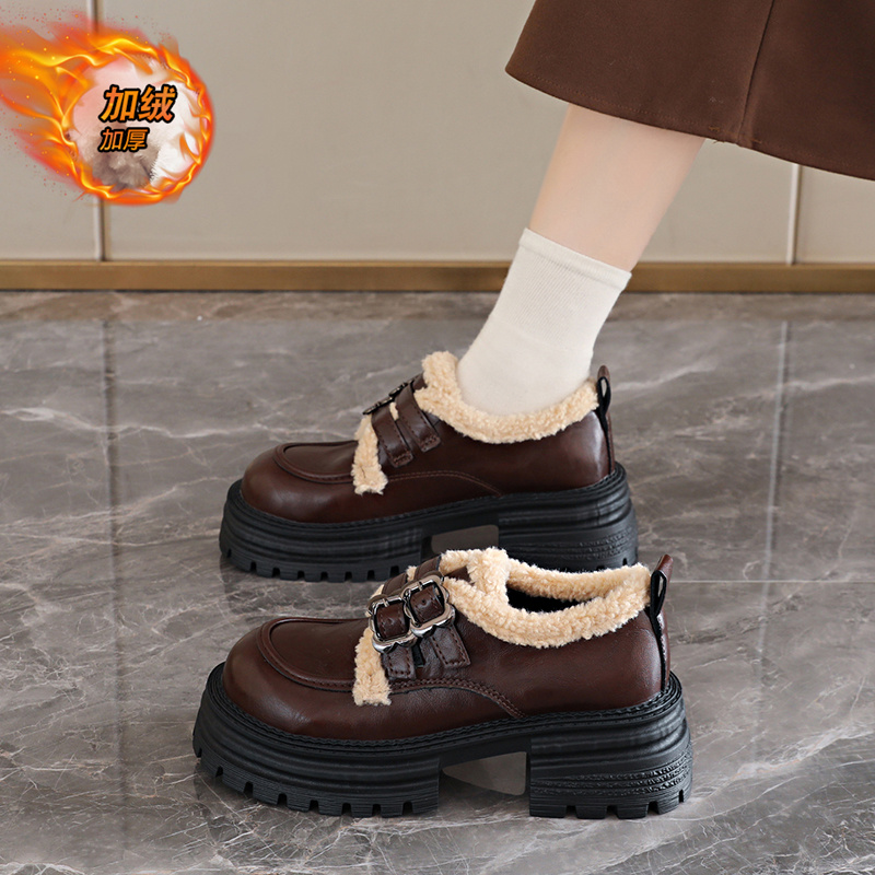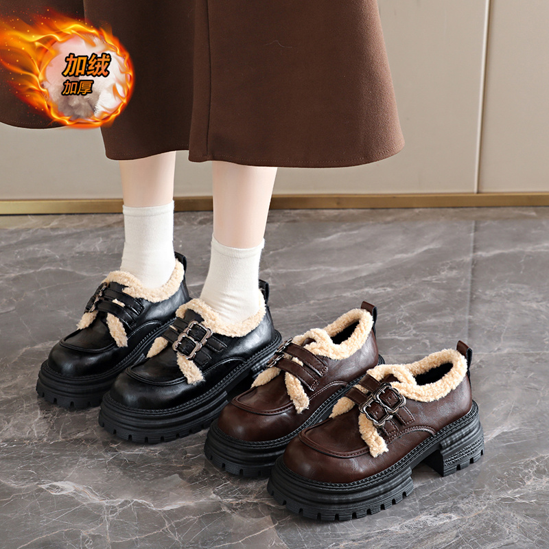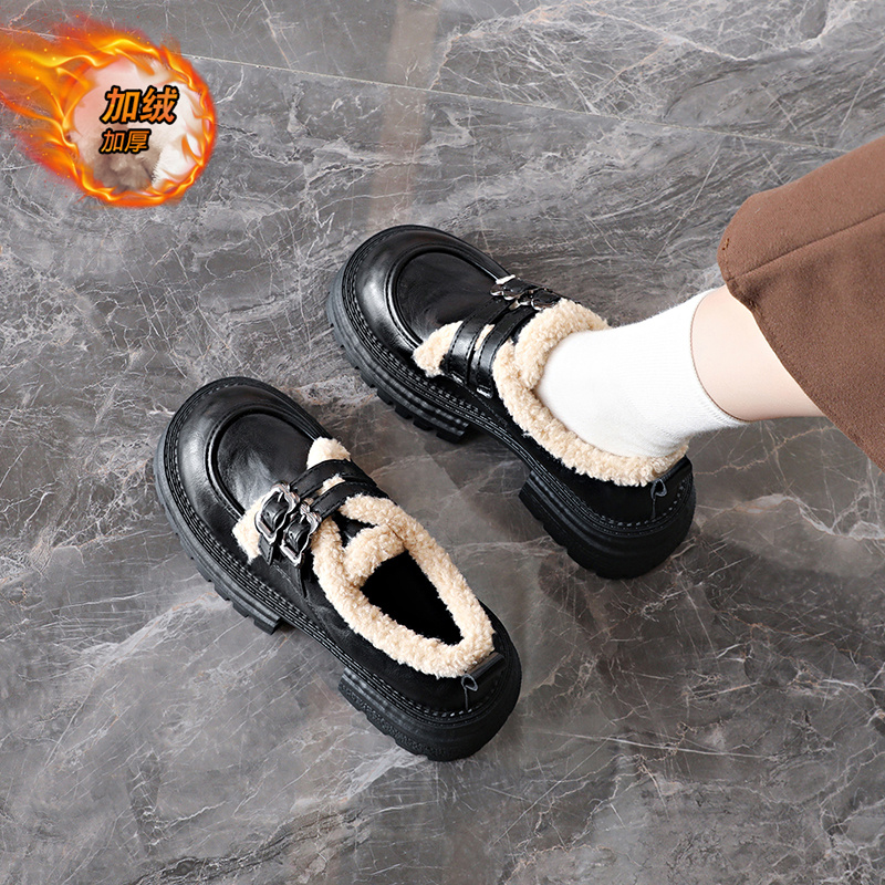 厚底一脚蹬保暖二棉小皮鞋 冬季 黑色 女2025年新款 英伦风加绒乐福鞋