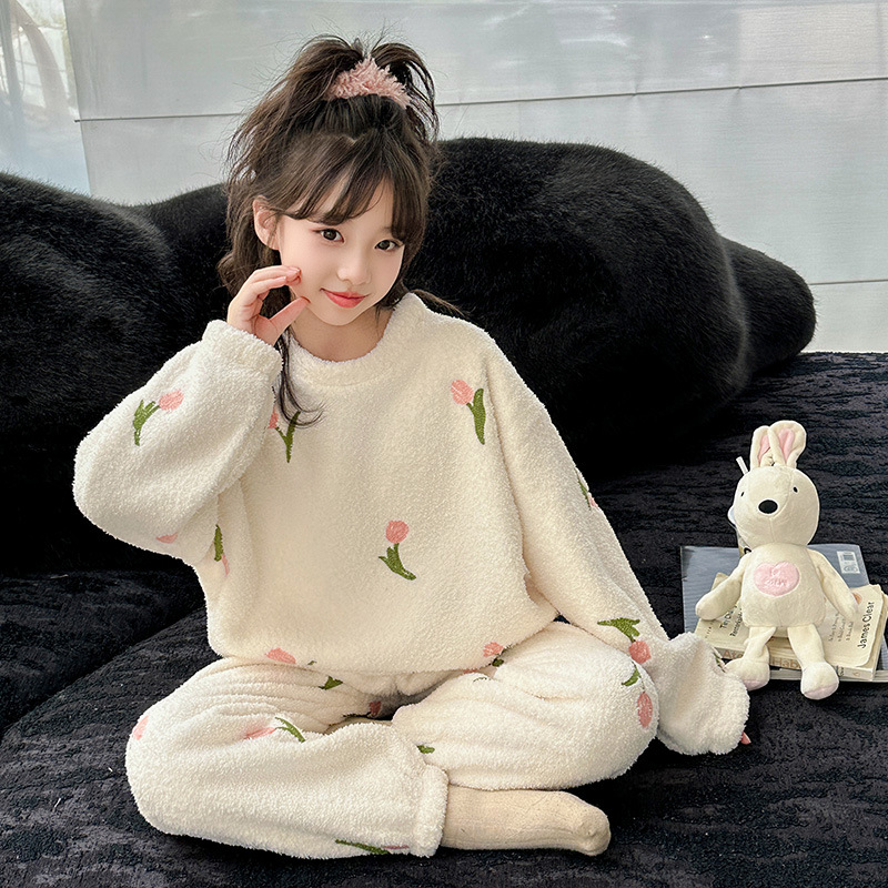 初中生珊瑚绒加绒套装 女童睡衣秋冬2025新款 女孩半边绒家居服冬季