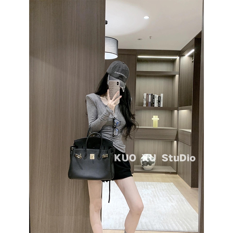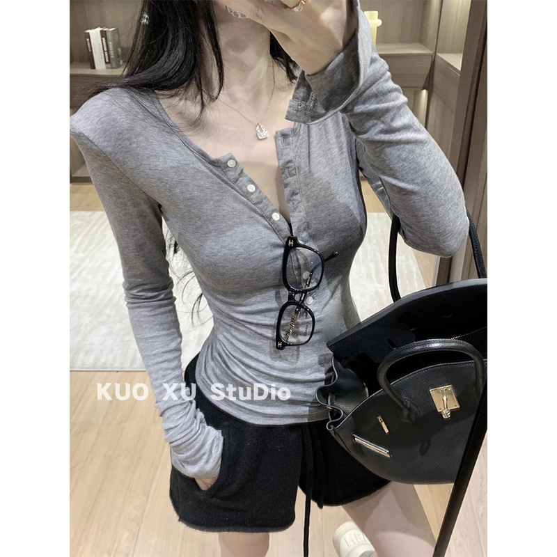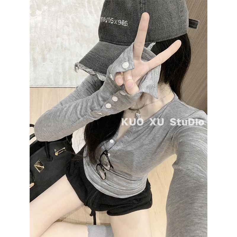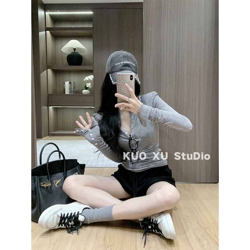 套装 早秋穿搭V领辣妹气质长袖 显瘦短裤 设计感宽松上衣修身 女 T恤衫