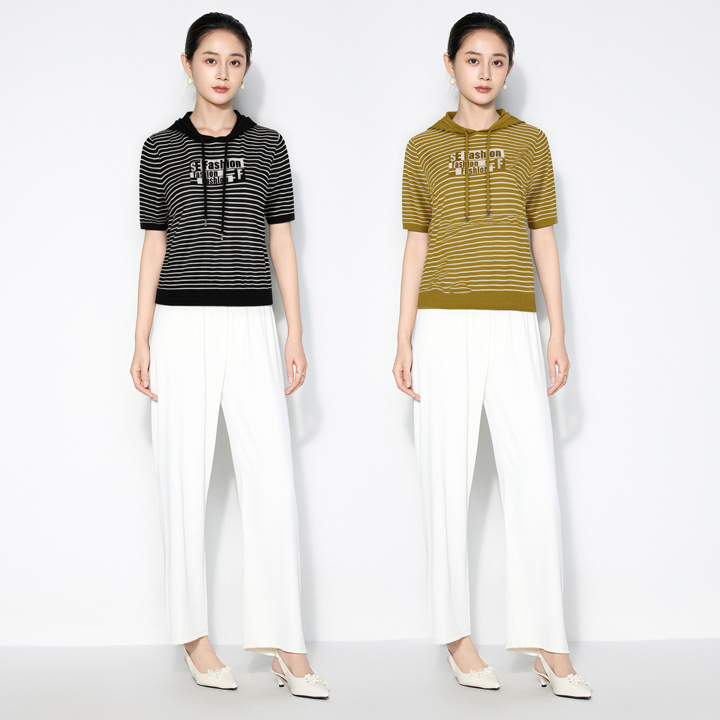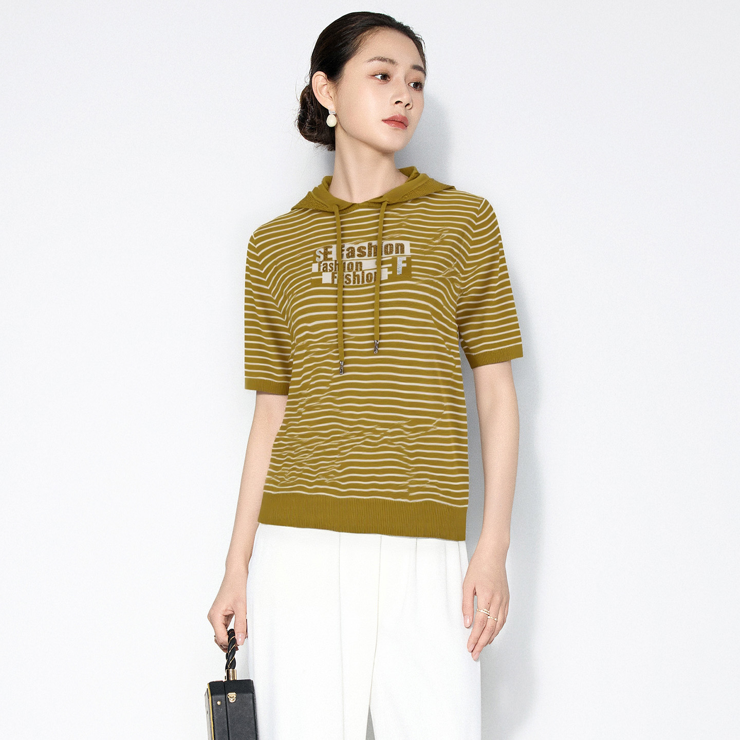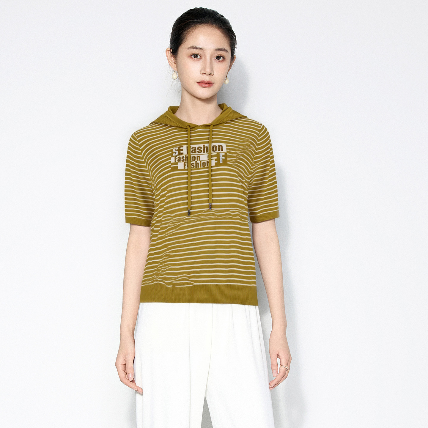 T恤上衣小衫 短袖 气质女 条纹莱赛尔连帽针织衫 马天奴2025春夏新款