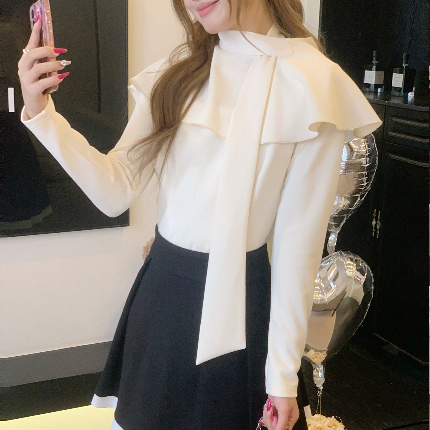 高腰半身裙套装 ATAR名媛淑女秋装 打底衫 洋气斜翻领两件套长袖 新款
