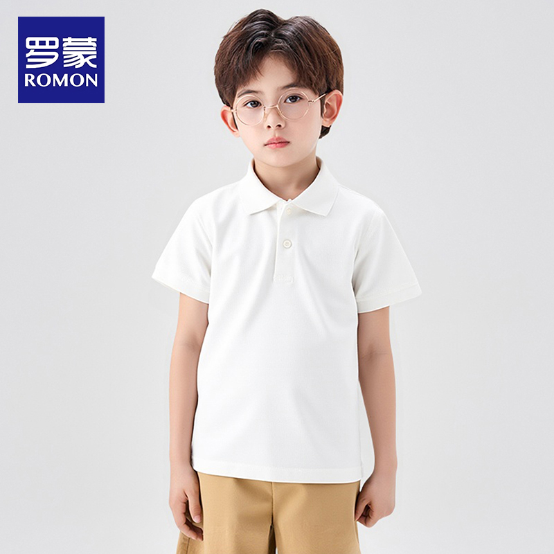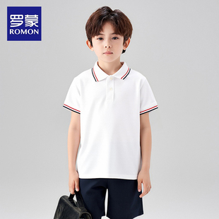 罗蒙小学生白色校服男童女童短袖 纯男孩初中棉班服 T恤儿童POLO衫