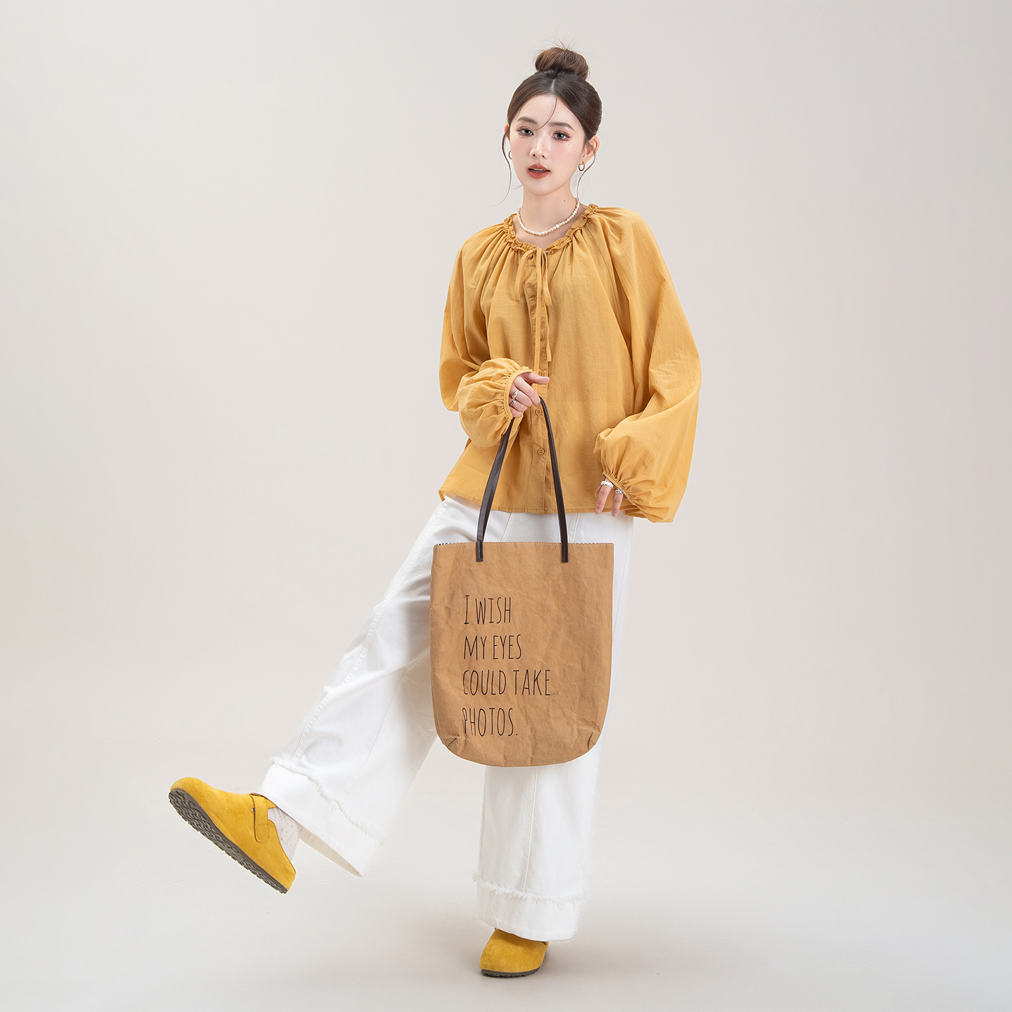 新款 女秋季 韩系温柔甜美百搭系带上衣 衬衫 橘色木耳花边领灯笼长袖
