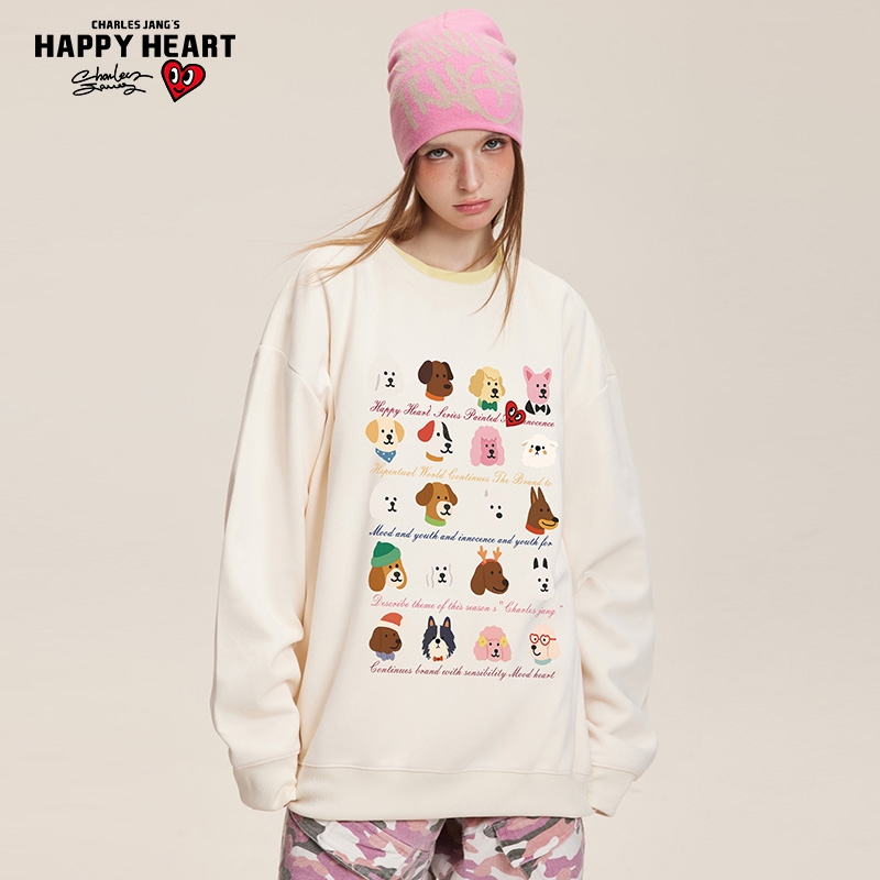 无帽宠物狗印花情侣学生长袖 圆领卫衣男女春秋季 美式 查尔斯桃心