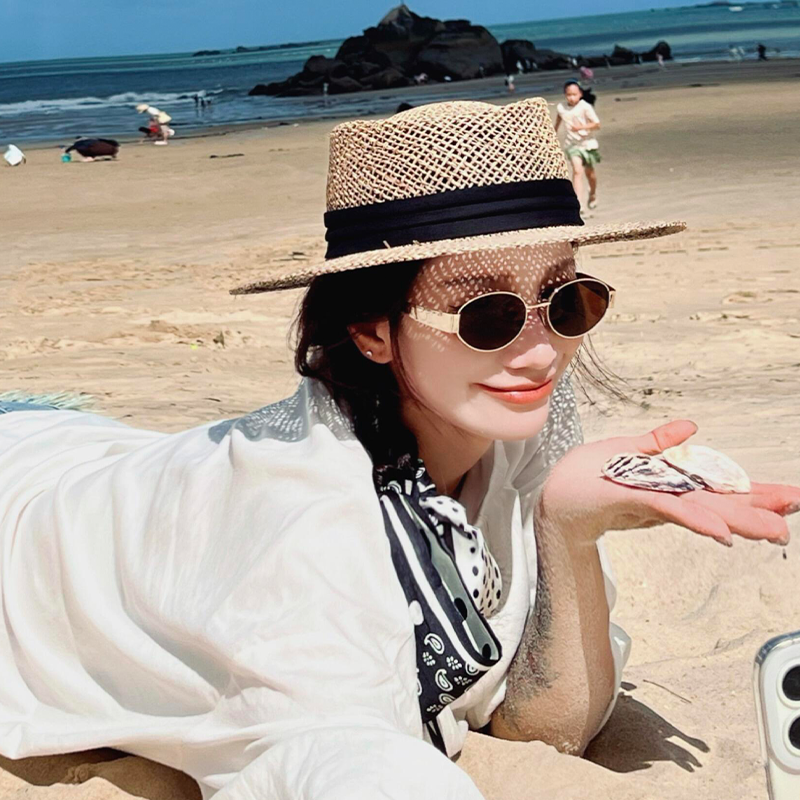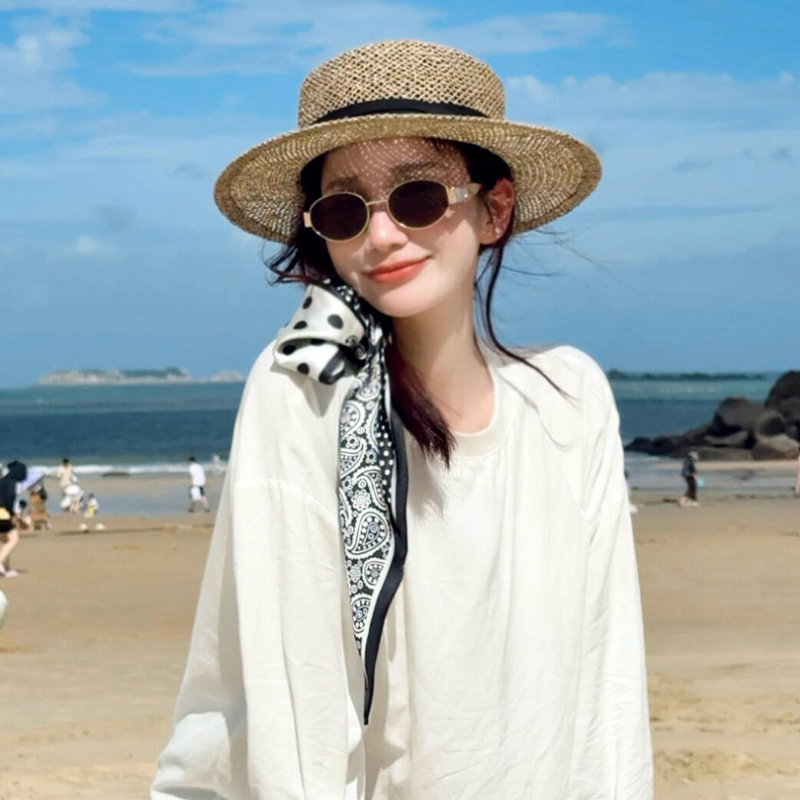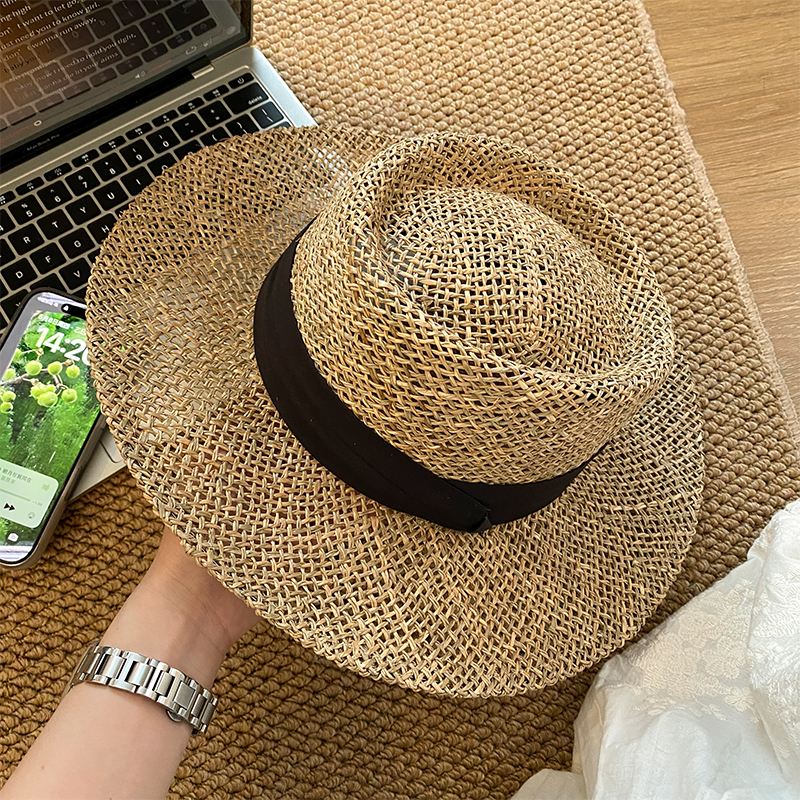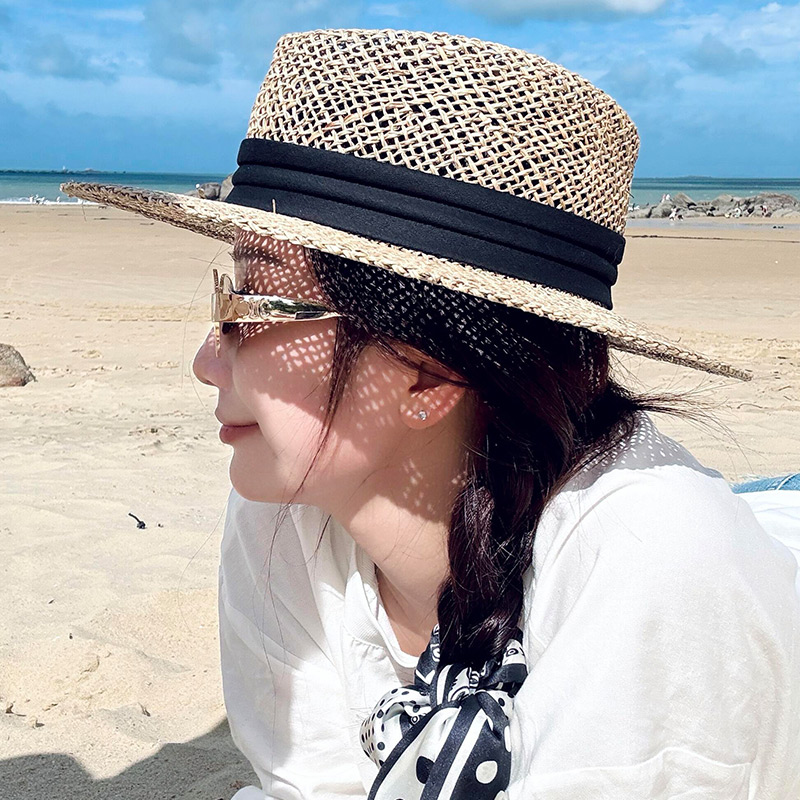 咸草镂空平顶草帽女夏季 遮阳防晒太阳帽子 海边沙滩度假风礼帽法式