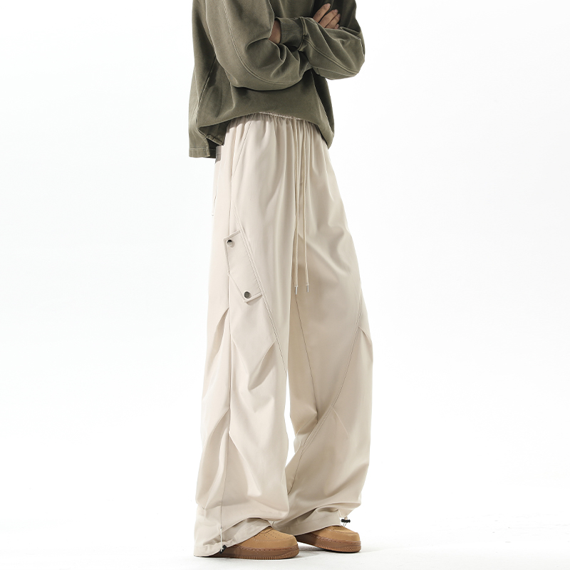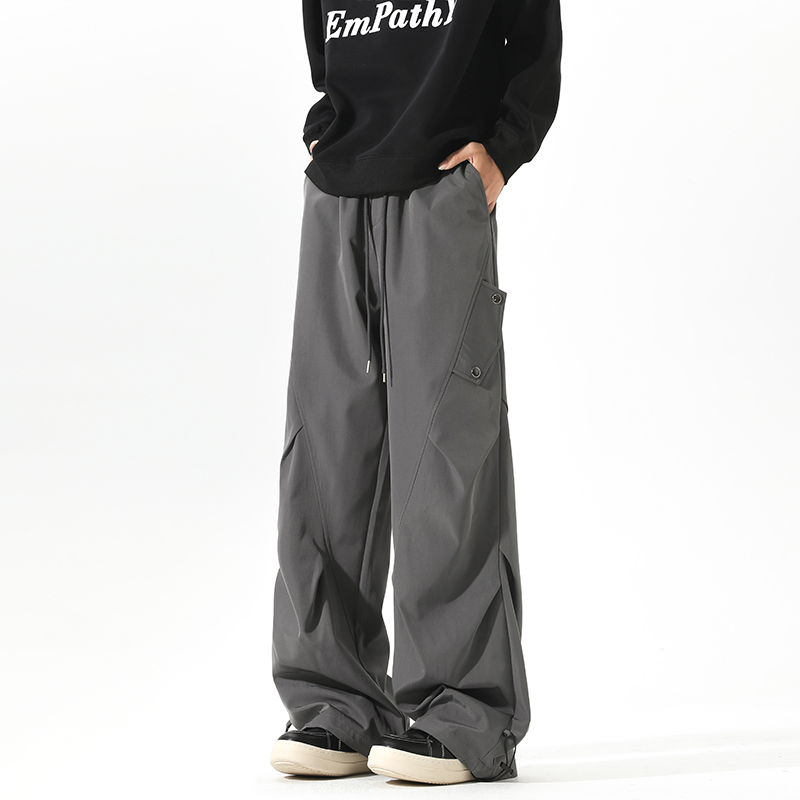 新款 子男春秋季 美式 冲锋阔腿裤 工装 潮牌设计感褶皱情侣伞兵长裤 裤