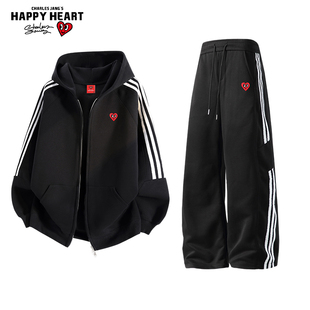两件套运动套装 查尔斯桃心 休闲裤 连帽卫衣春秋季 拼色三条杠开衫