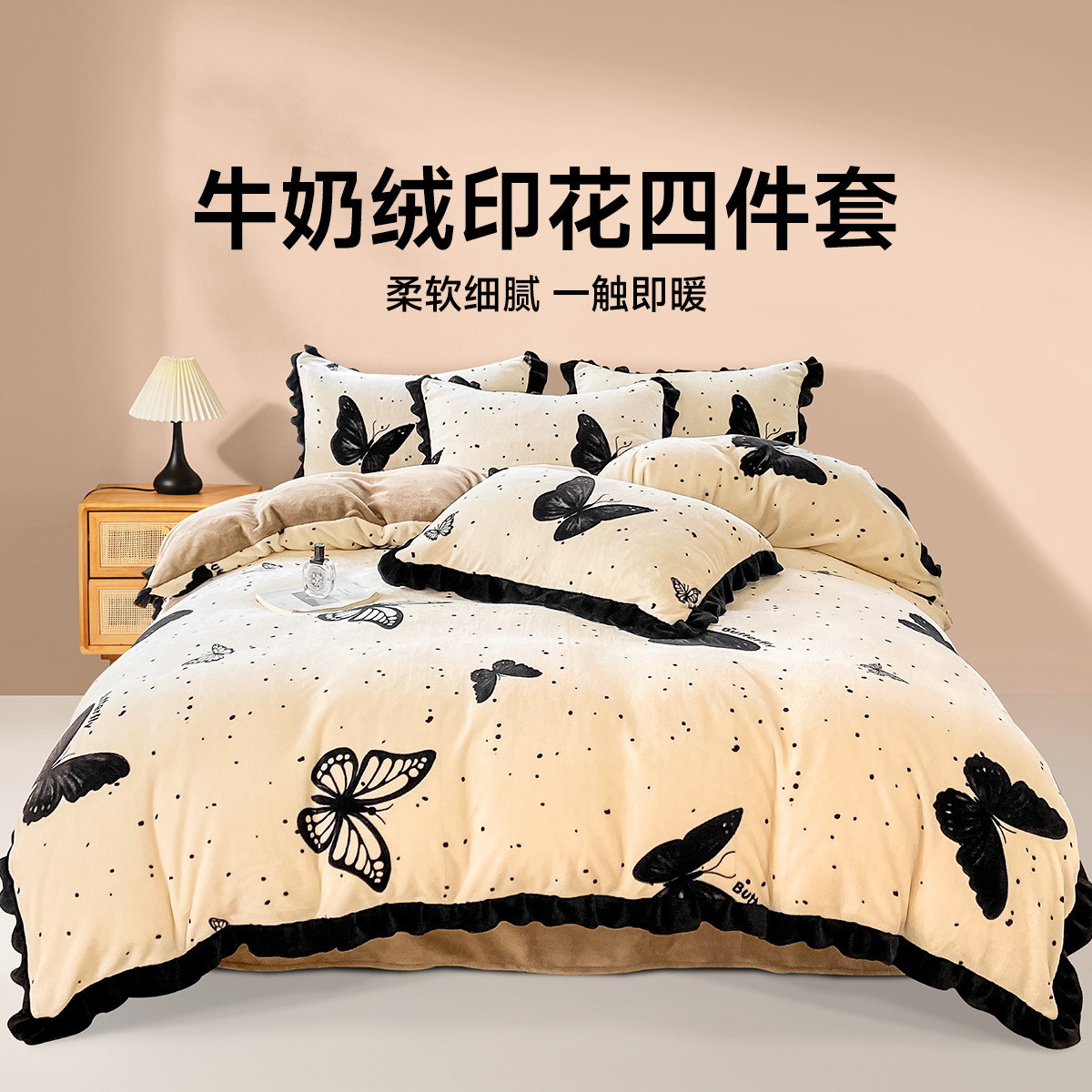 公主风牛奶绒四件套冬季 加厚花边被套珊瑚法莱三件套毛绒床单床品