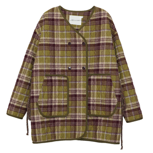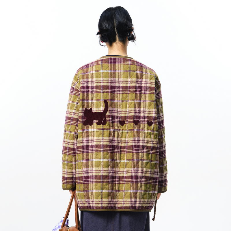 棉外套女 .FUN系列贴袋绣花格纹抽绳中长款 MOVEUP幻走2025秋季 新款