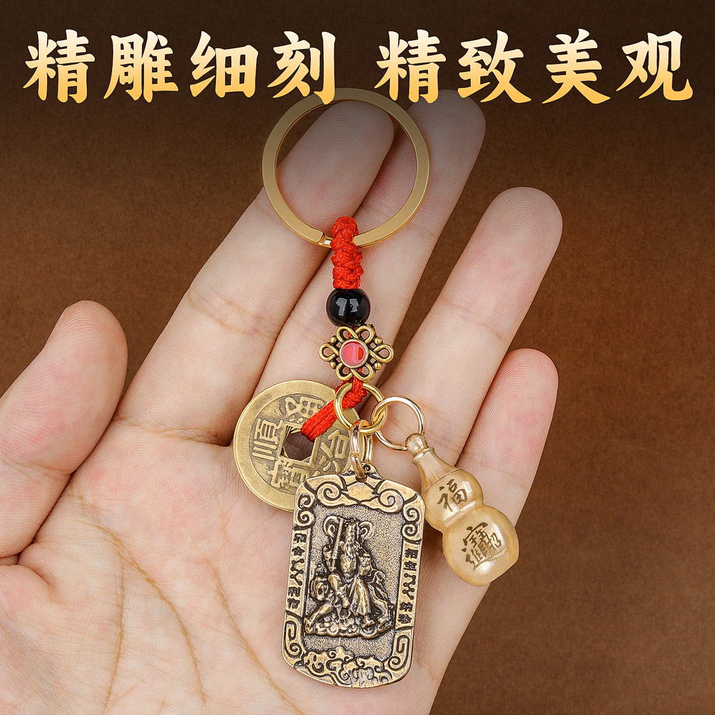 纯黄铜武财神赵公明令牌招财进宝随身五帝钱葫芦汽车钥匙扣挂件