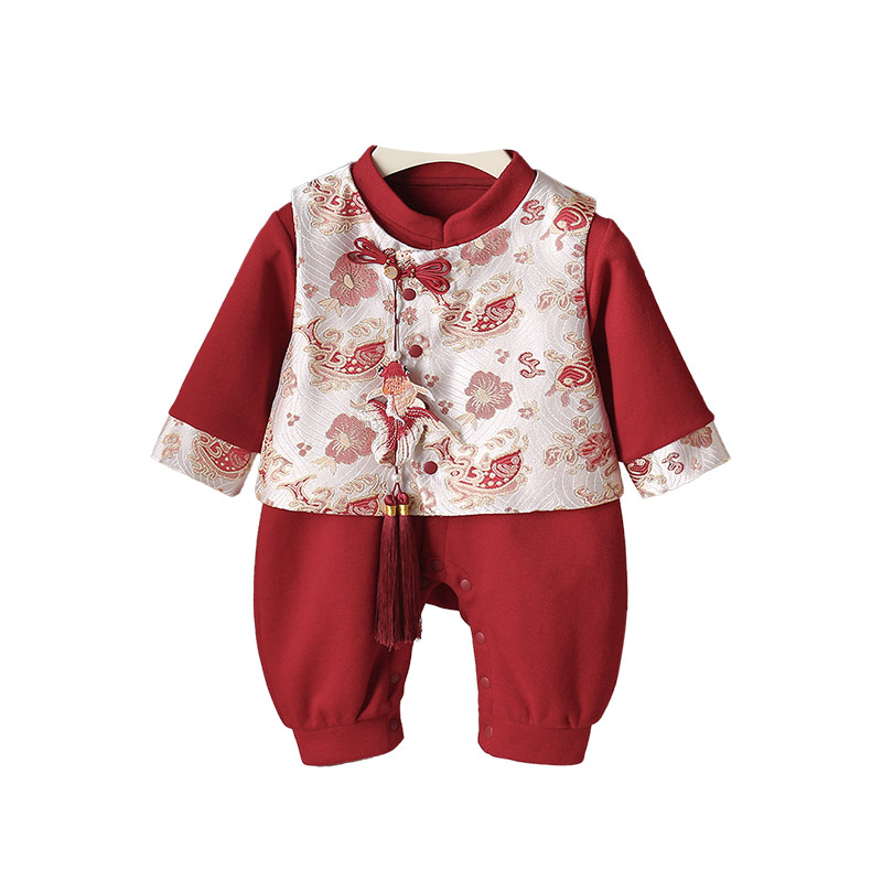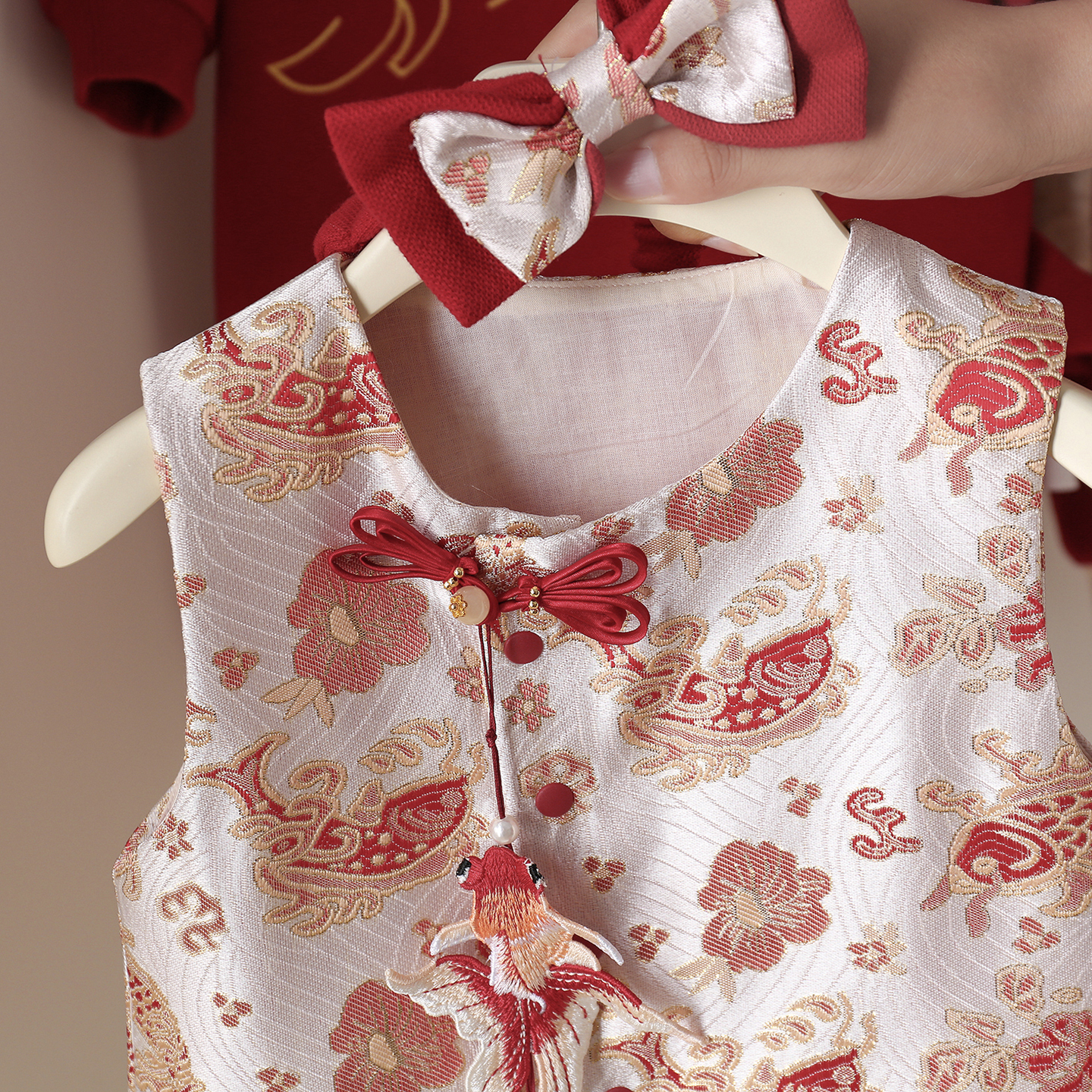 kmi新生儿秋装 小金鱼马甲外套满月百天抓周礼服 连体衣女宝宝中式