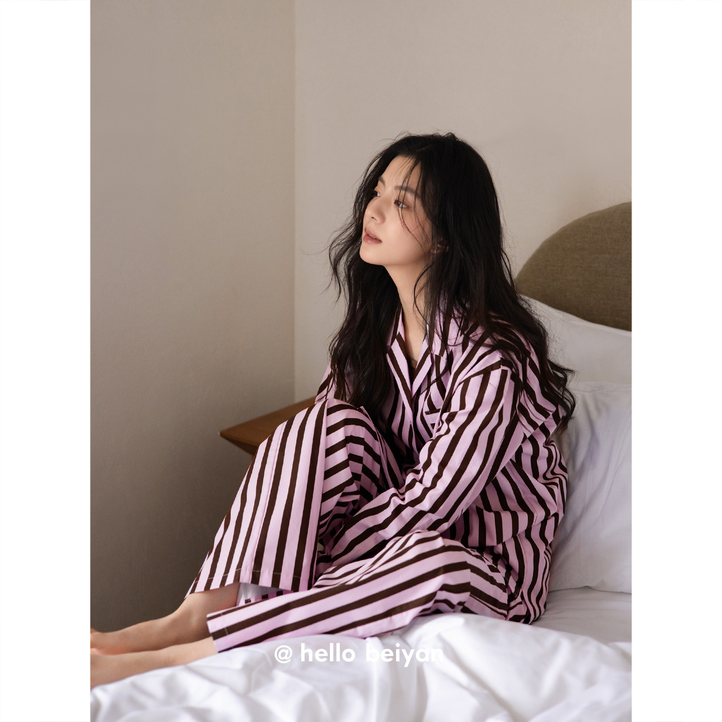 套装 贝妍睡衣女春秋新款 长裤 长袖 柔软莫代尔棉家居服简约条纹开衫