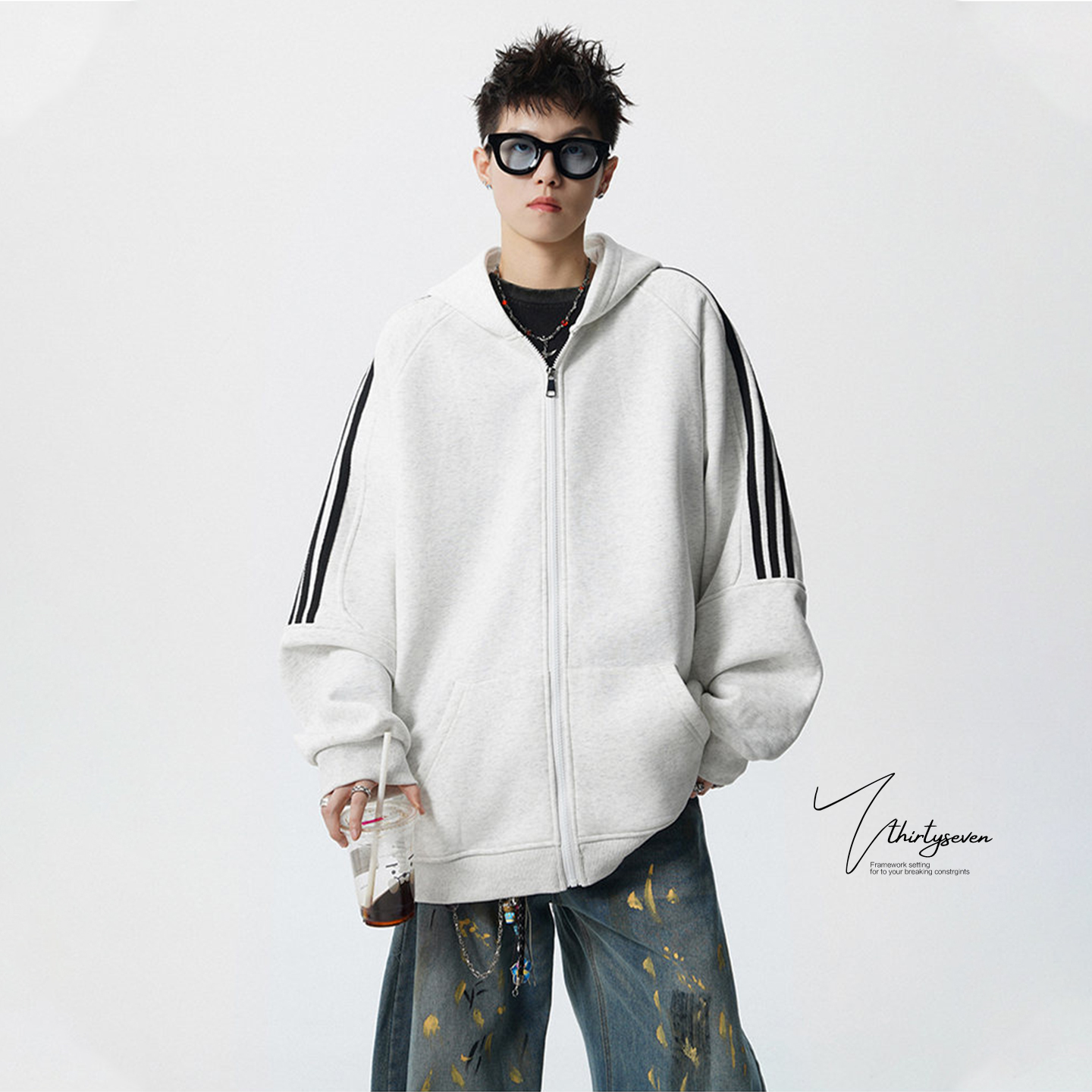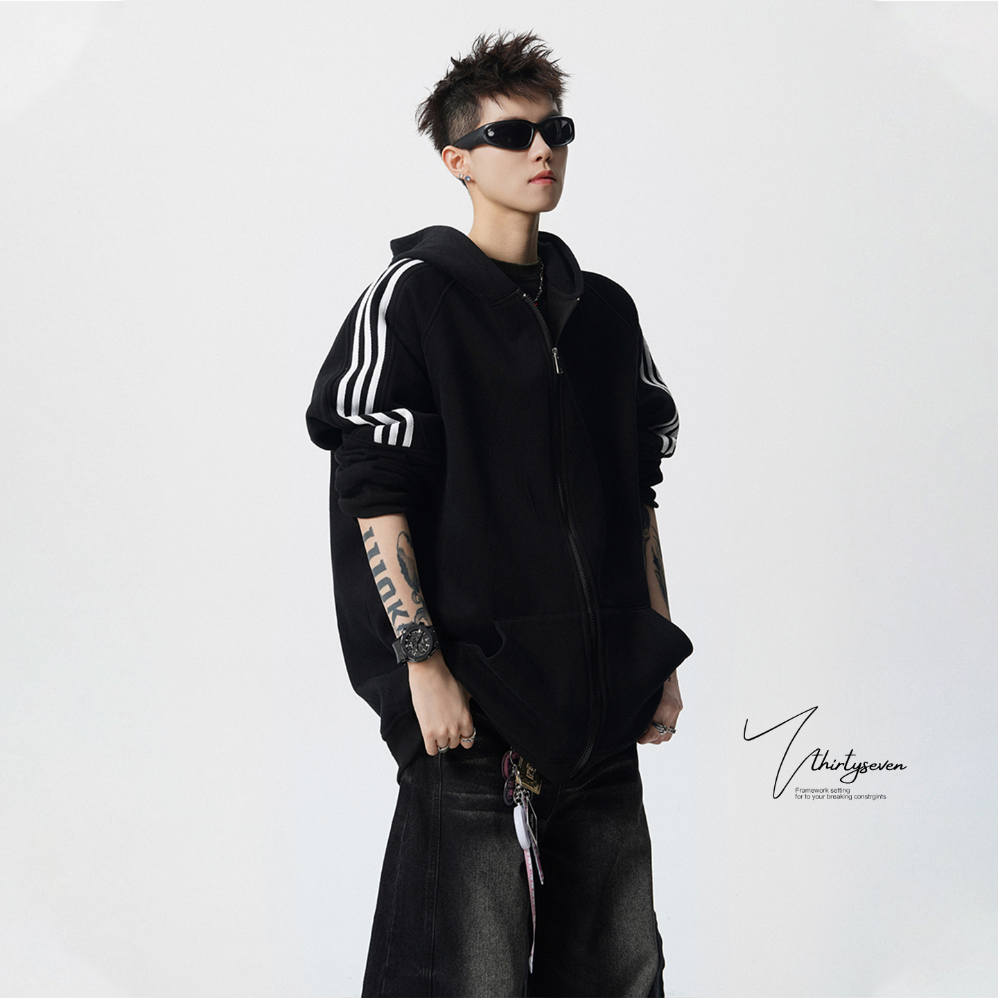 V37潮牌设计感宽松休闲情侣外套男秋美式 卫衣 三条杠撞色连帽开衫