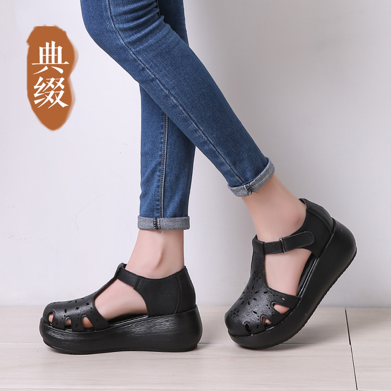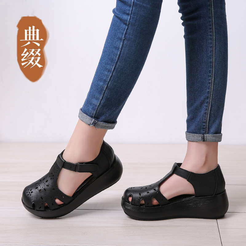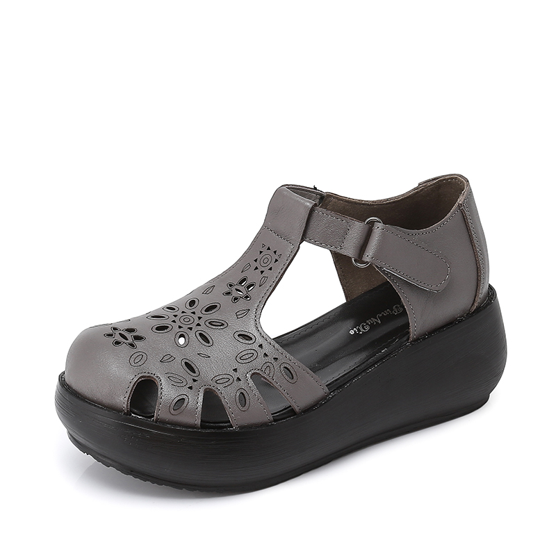 复古镂空手工真皮中空女凉鞋 典缀春夏包头凉鞋 坡跟软底全皮女鞋