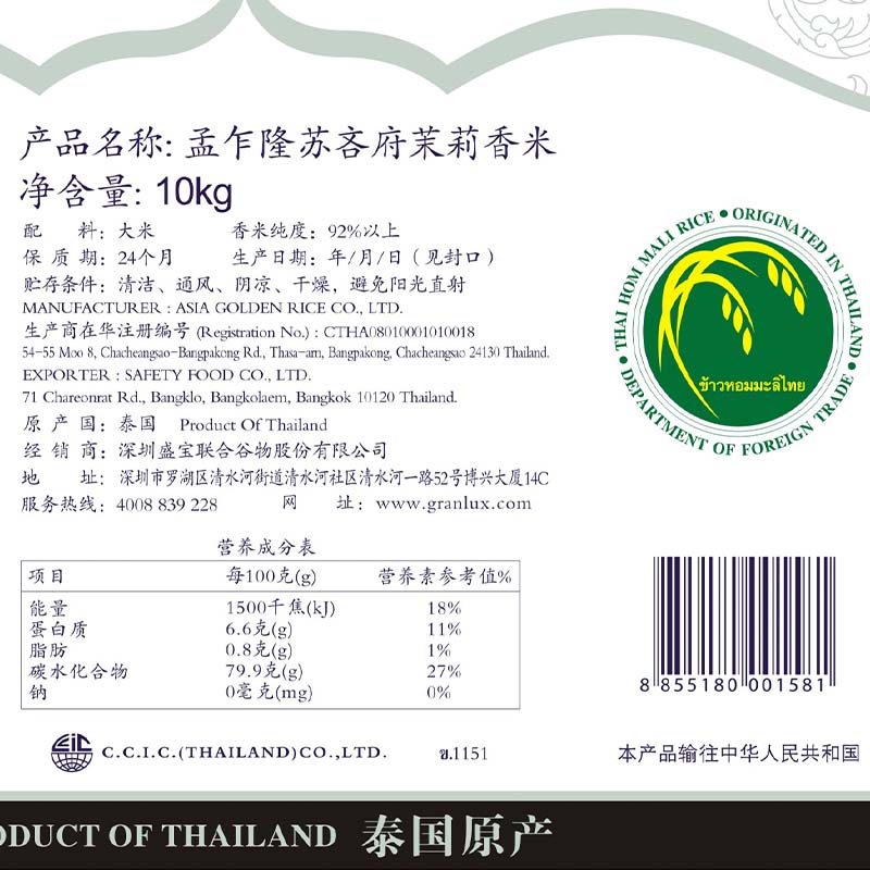 孟乍隆苏吝府泰国茉莉香米20斤原装 进口长粒香大米10kg