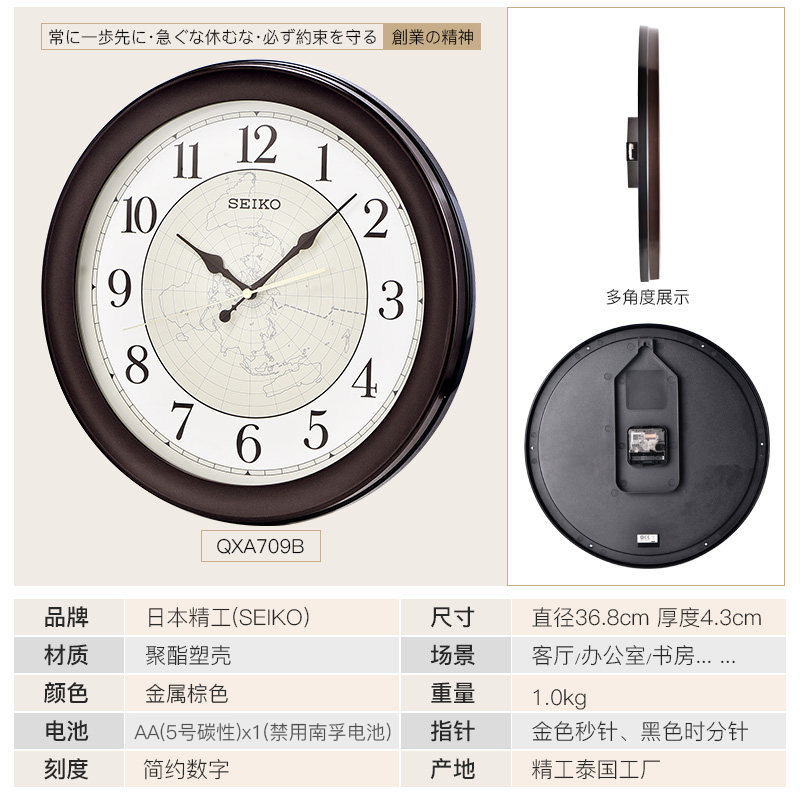 SEIKO日本精工时钟14英寸棕色现代简约地图钟面客厅卧室石英挂钟