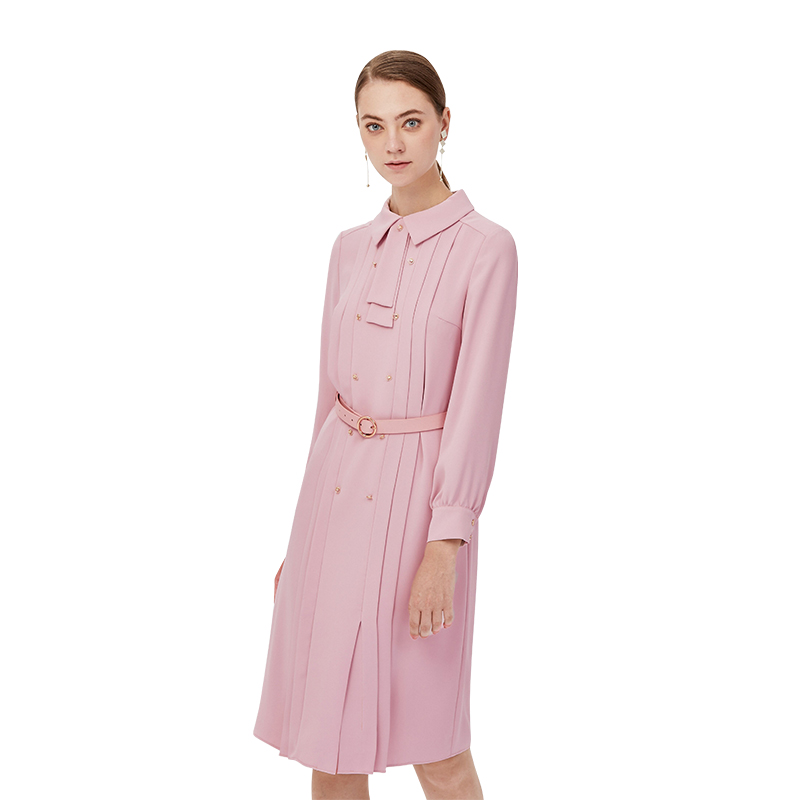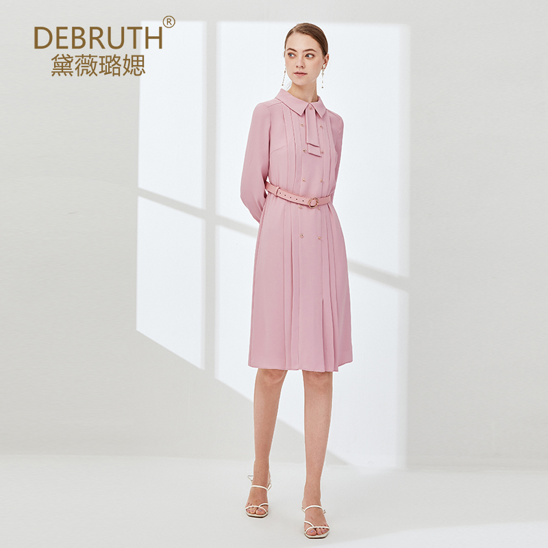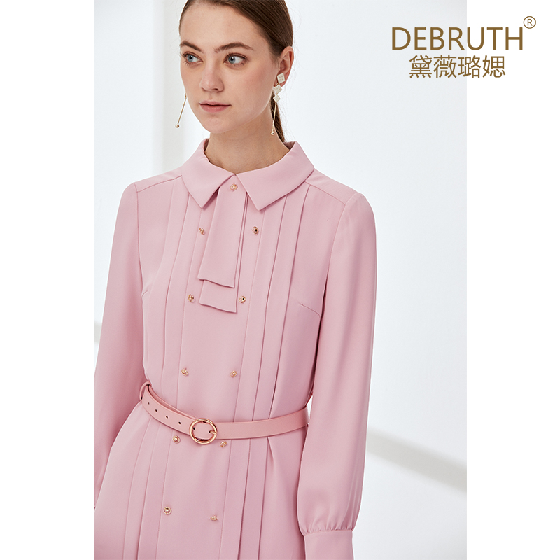 气质收腰A裙 法式 黛薇璐媤粉色蝴蝶领结长袖 衬衣连衣裙女春秋新款