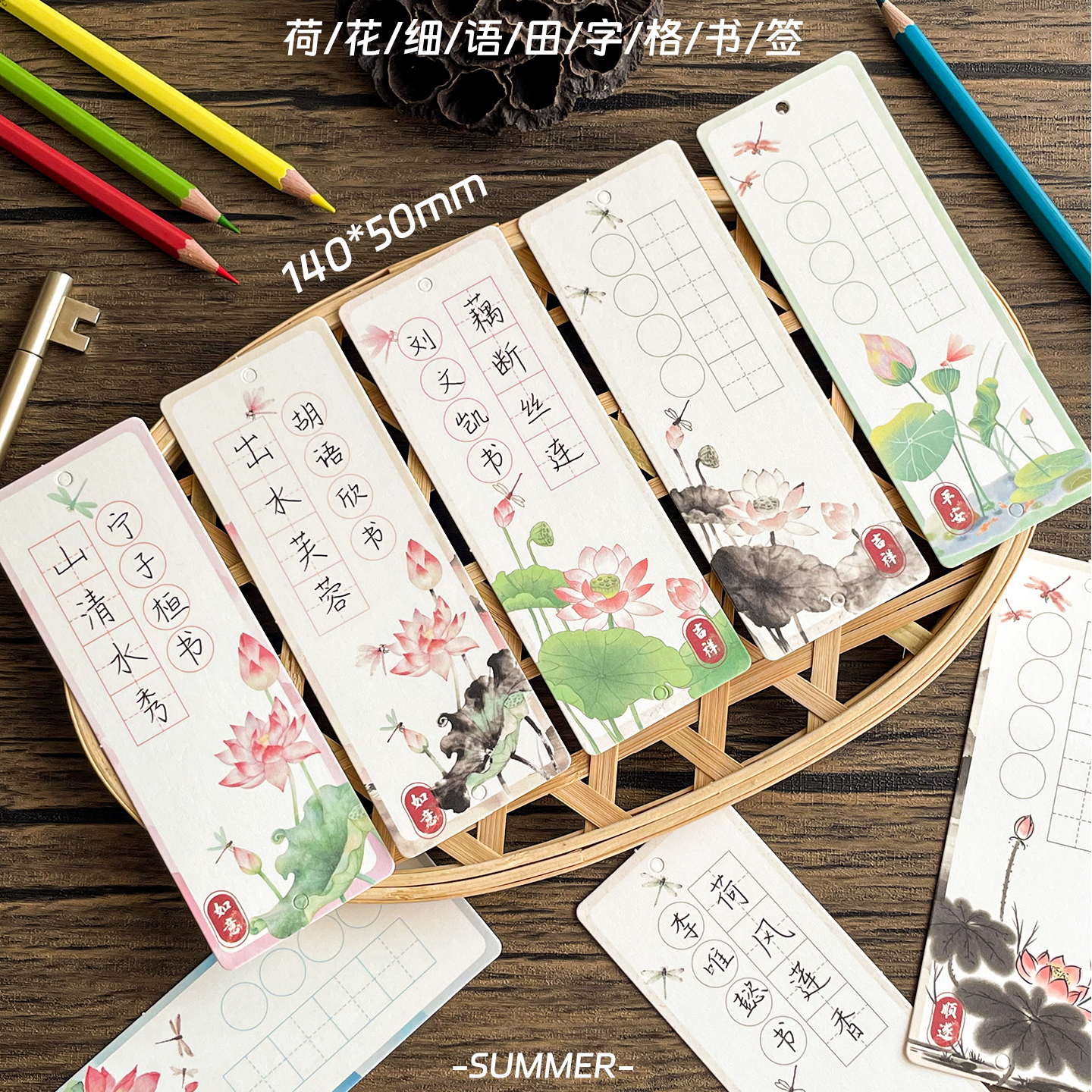 创意荷花主题田字格书法书签学生用古风小清新钢笔铅笔书写练字彩色卡片纸奖品纸质一二年级文创用品奖励礼物