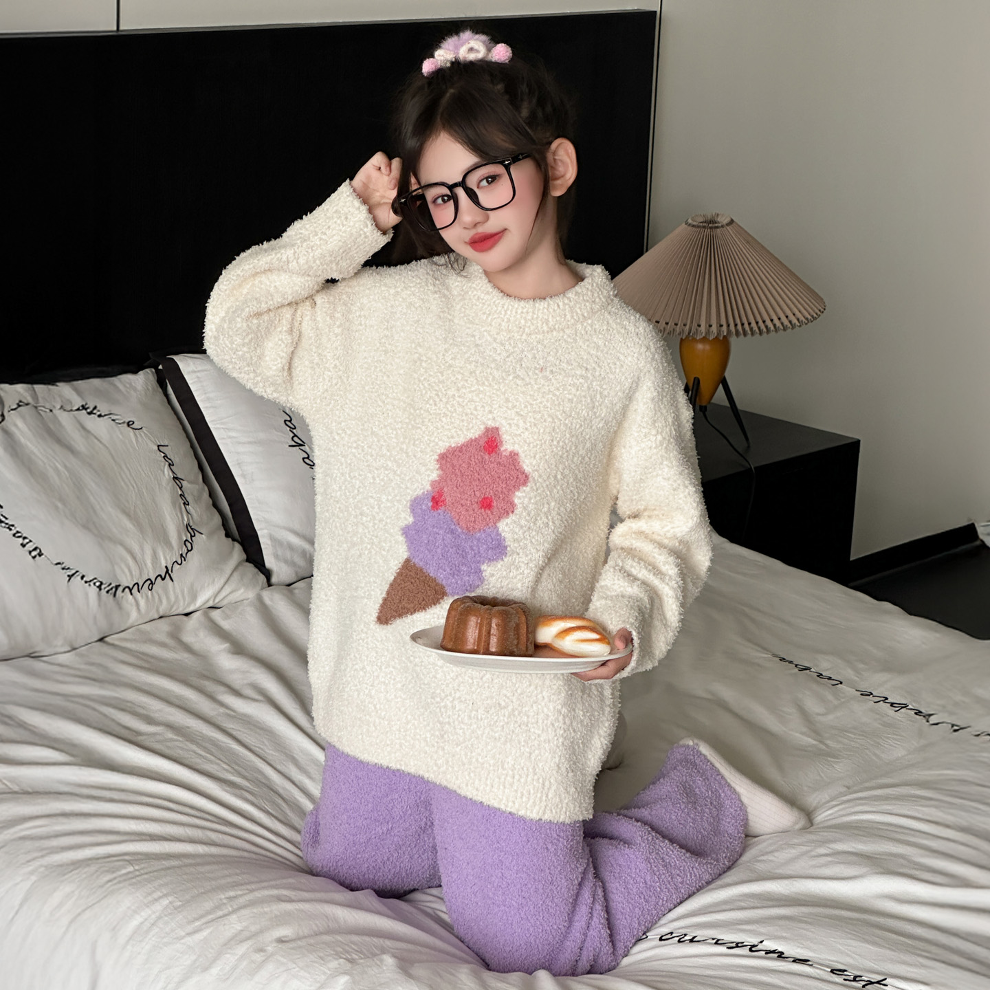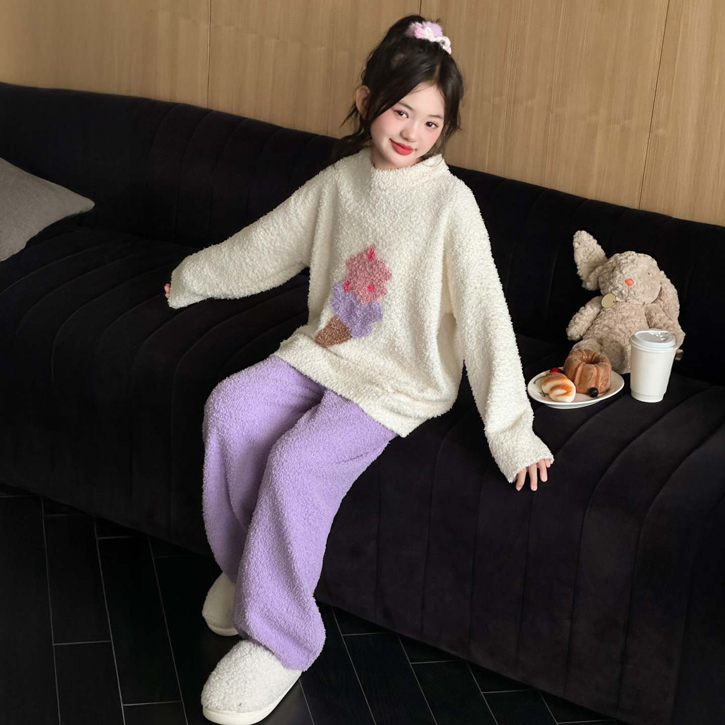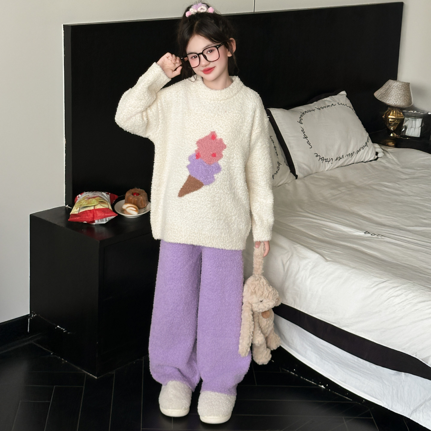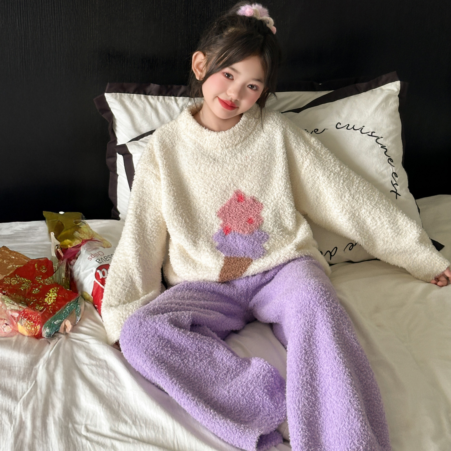 女童睡衣秋冬2025新款 初中生女孩加厚珊瑚绒家居服 儿童半边绒套装