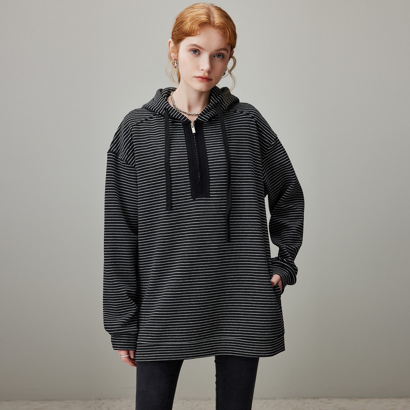 半拉链宽松长袖 新款 T恤 条纹连帽卫衣女2025年冬季 dfvc休闲中长款
