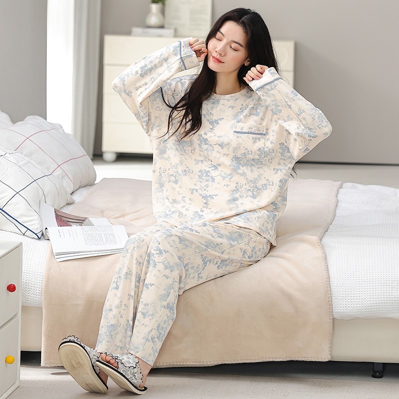 纯色全棉大码 猫人纯棉睡衣女春秋款 套装 长袖 宽松家居服 带胸垫开衫