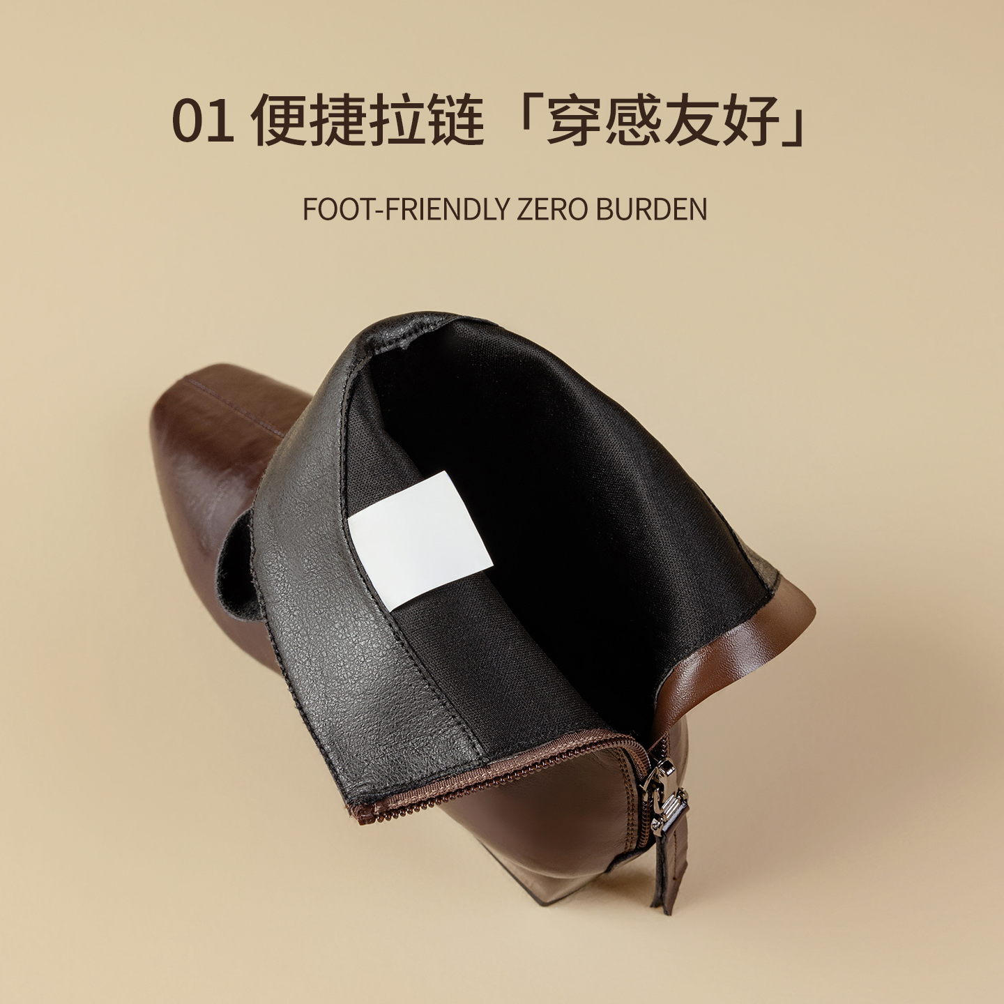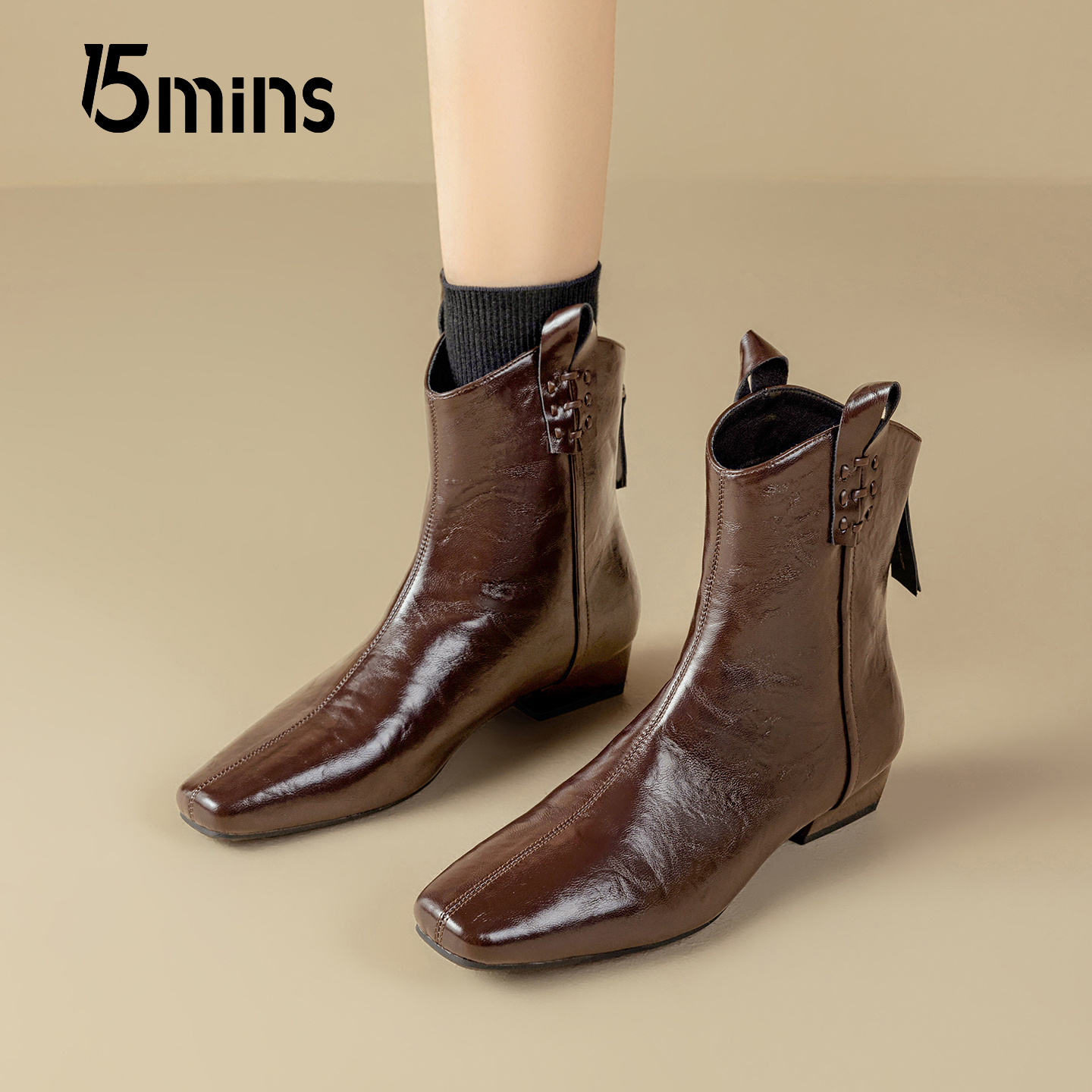 15mins尖头短靴子女秋季 复古牛仔靴子踝靴秋冬棕色马丁靴 2025新款