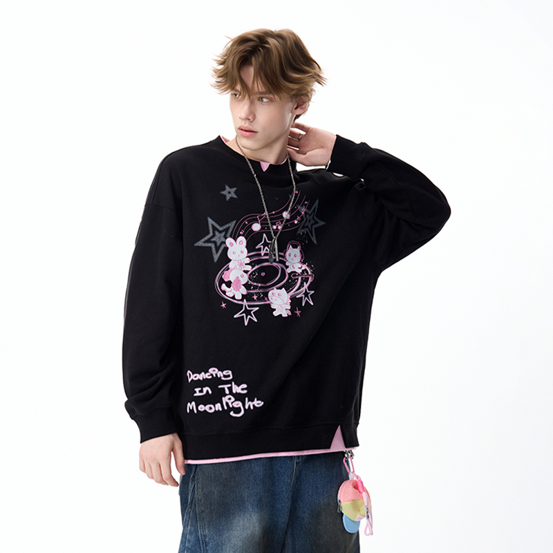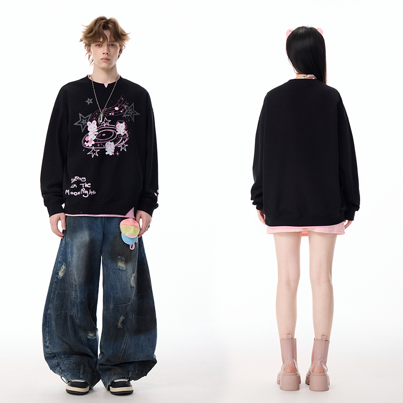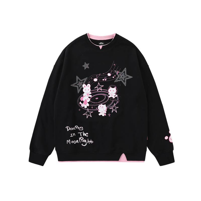 LAMLICKA黑色拼接假两件卫衣男冬季 潮牌重磅加厚宽松圆领套头上衣