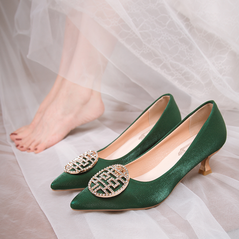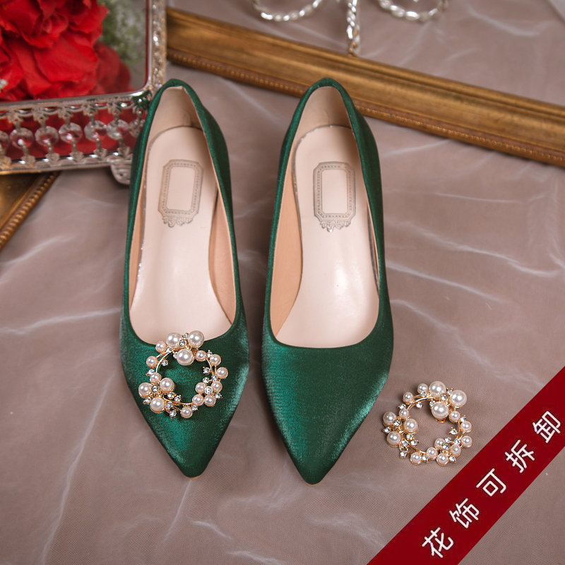 秀禾鞋 低跟粗跟结婚平底中式 女结婚新娘出门上车鞋 不累脚绿色婚鞋
