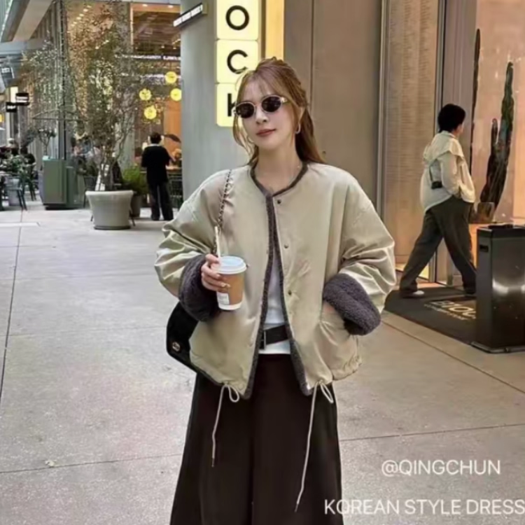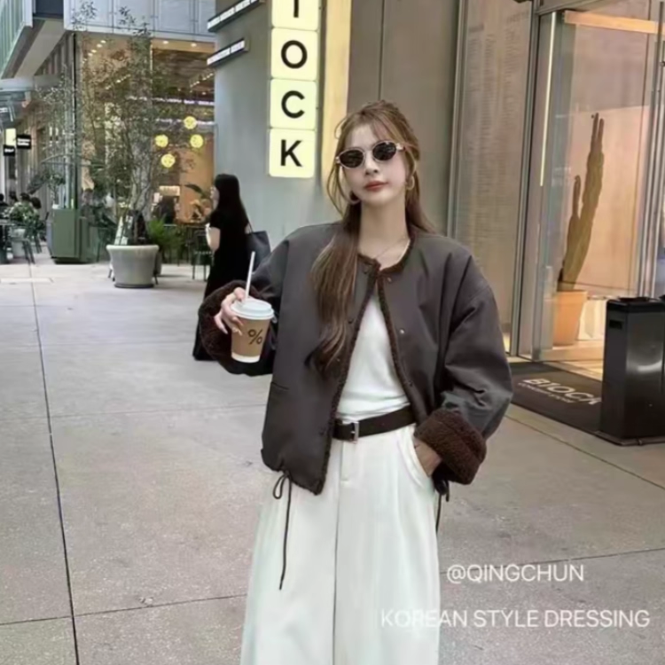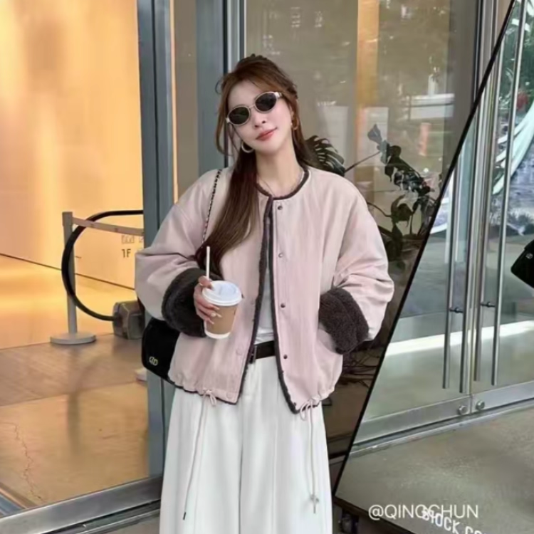 百搭气质上衣潮 时尚 欧洲站圆领拼接皮毛一体外套女2025秋冬季 新款