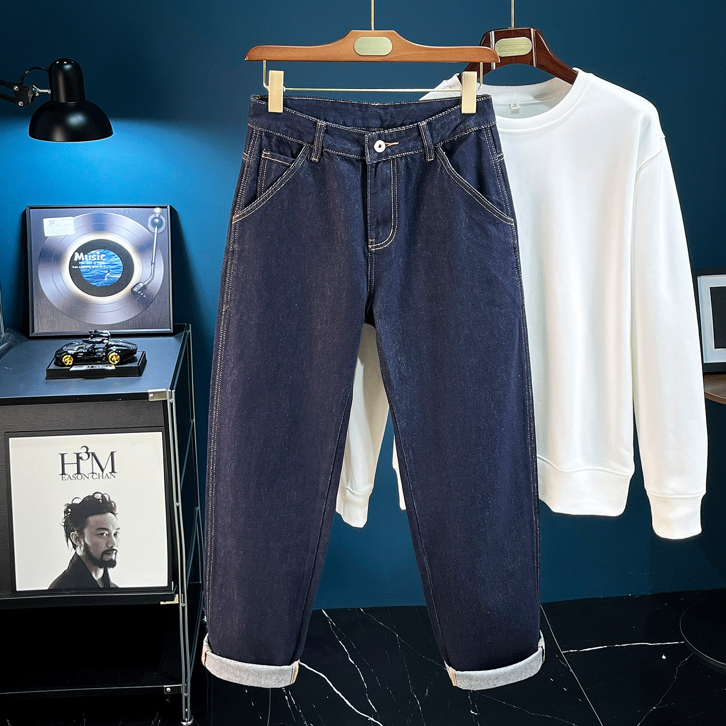 子潮流 深蓝色直筒休闲长裤 加绒加厚原色锥形牛仔裤 男宽松2025冬季