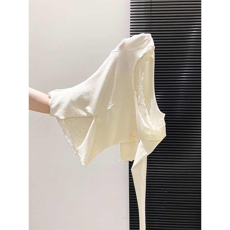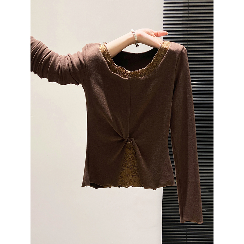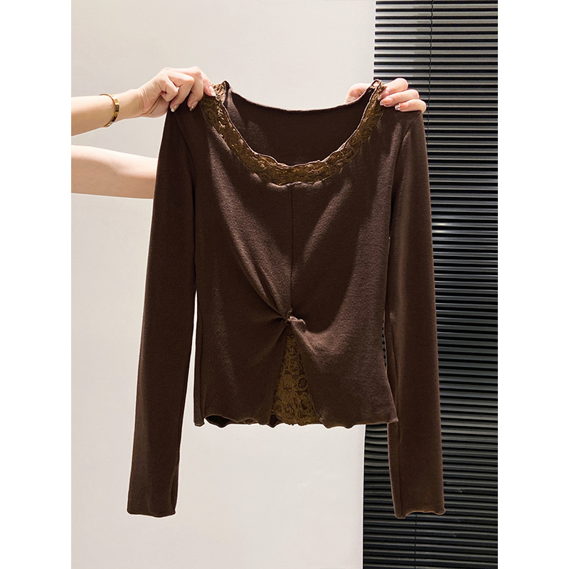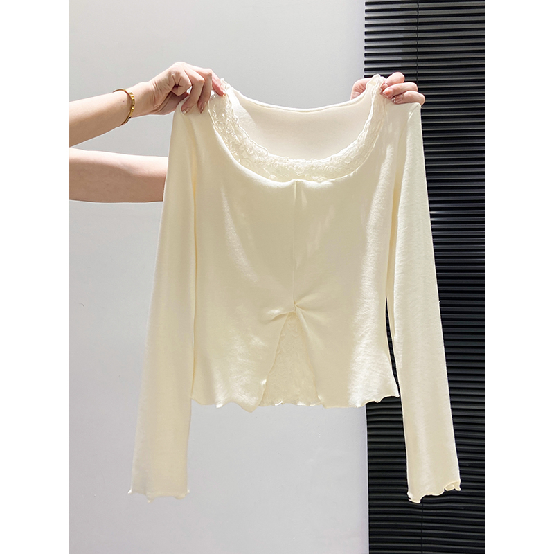 修身 新款 显瘦木耳边打底上衣 t恤女2025秋季 纯欲蕾丝花边圆领长袖