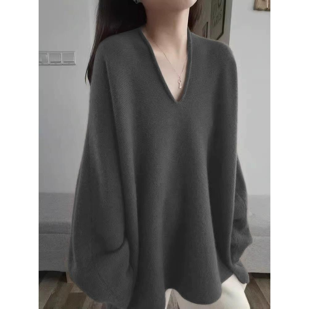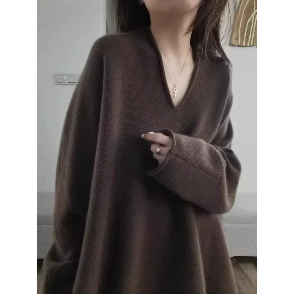 时髦宽松慵懒风显瘦套头长袖 v领毛衣女新款 1011n 黑色中长款 秋冬季