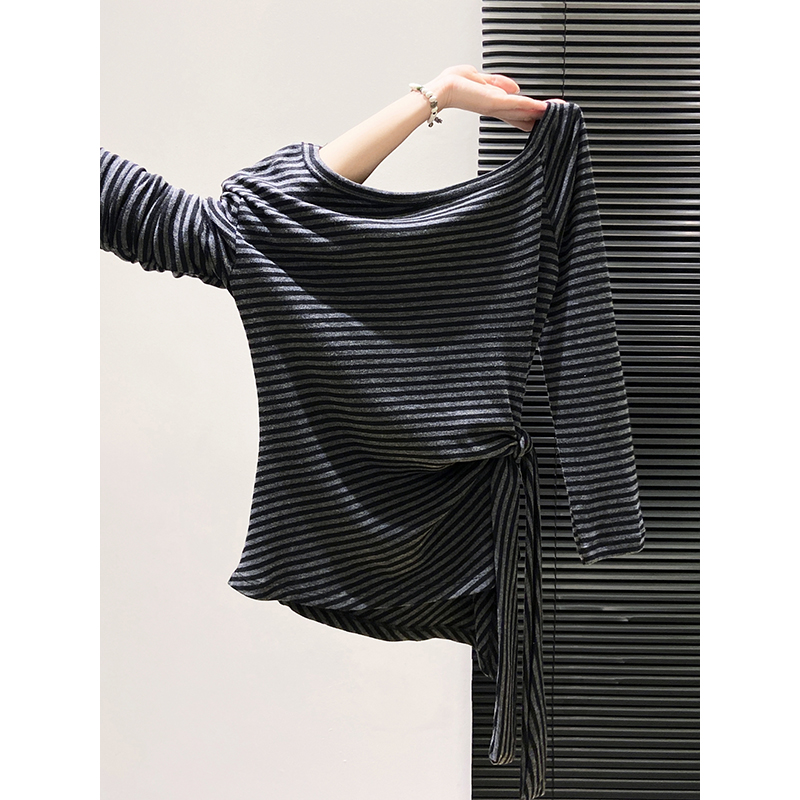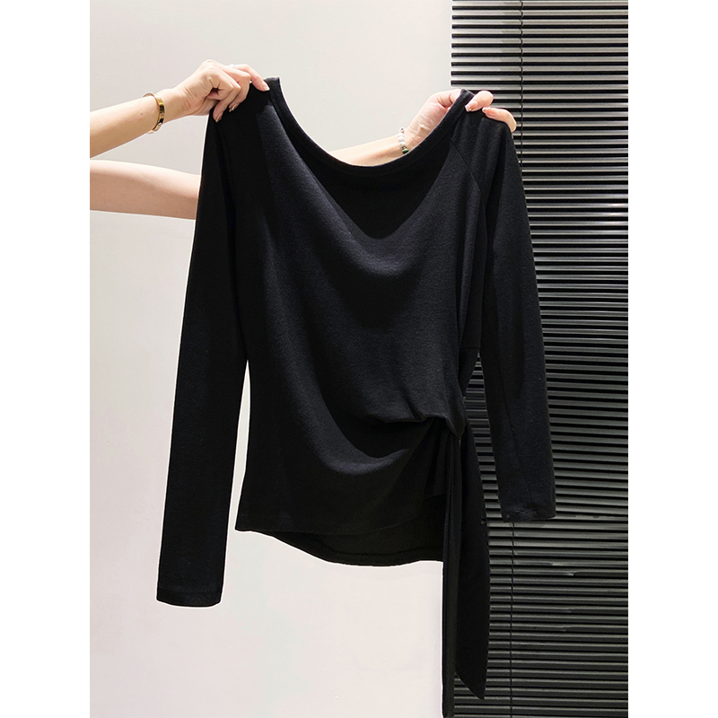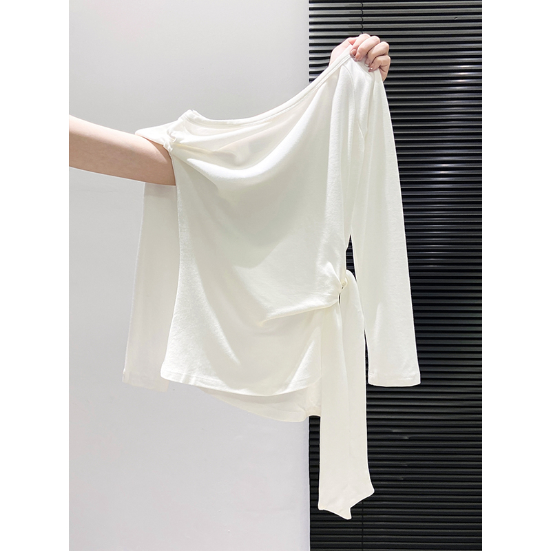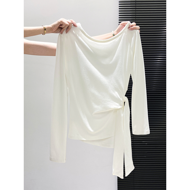 修身 新款 显瘦不规则打底上衣 t恤女2025秋季 白色绑带斜领露肩长袖
