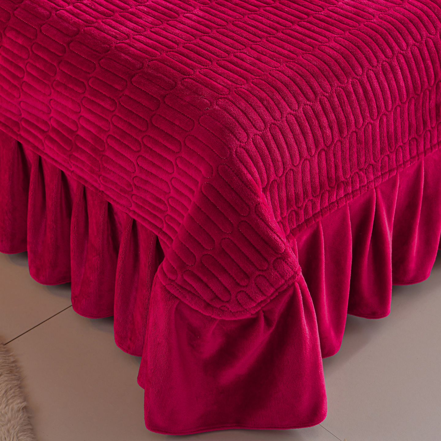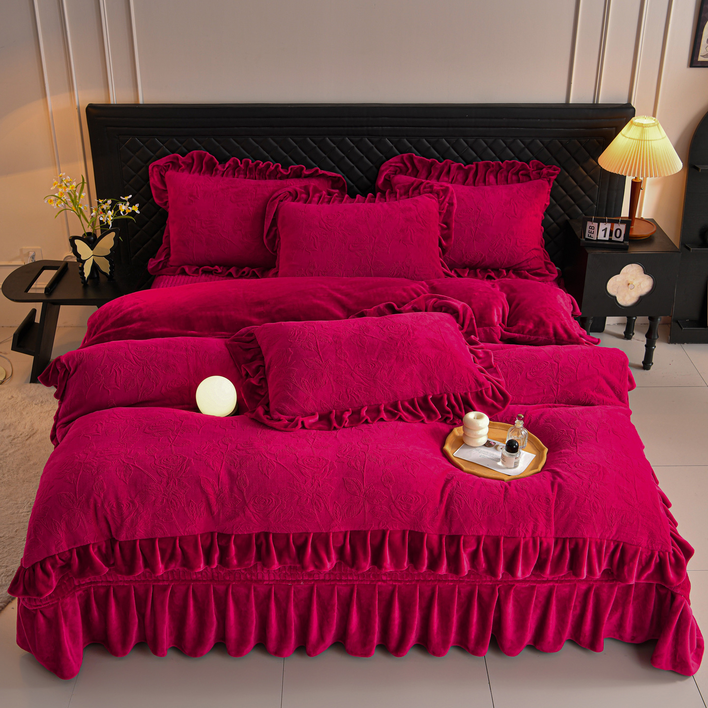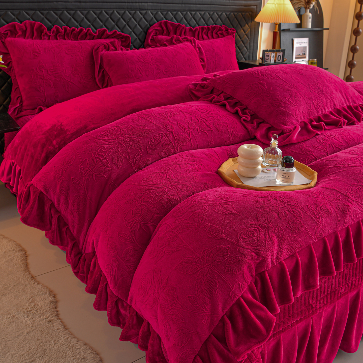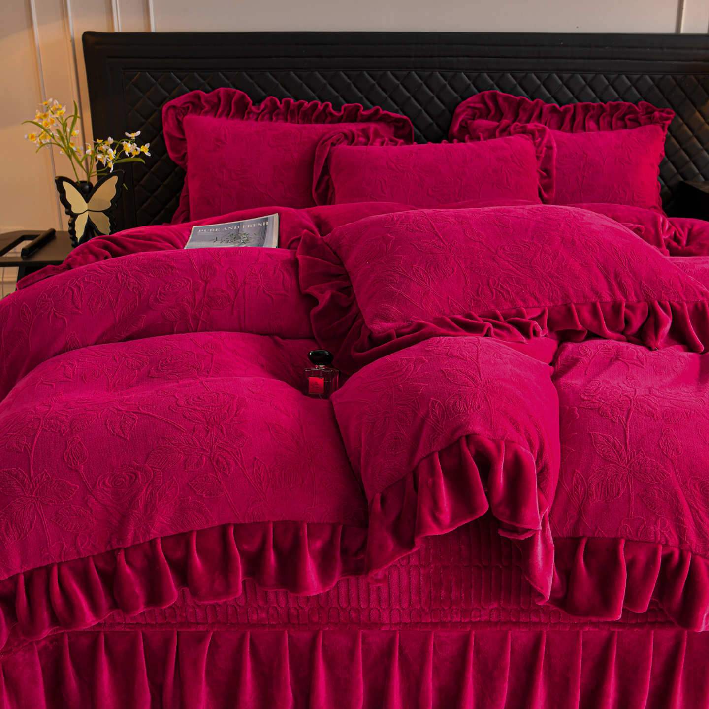 公主风雕花牛奶绒床盖四件套冬季 加厚花边被套珊瑚法莱毛绒床品
