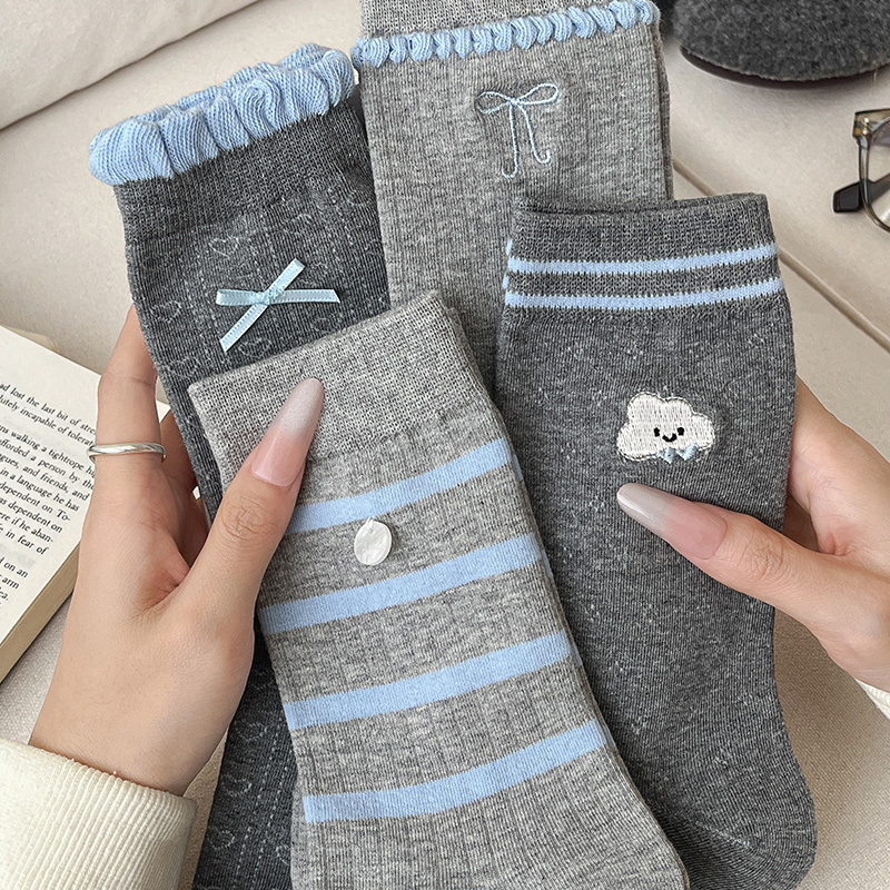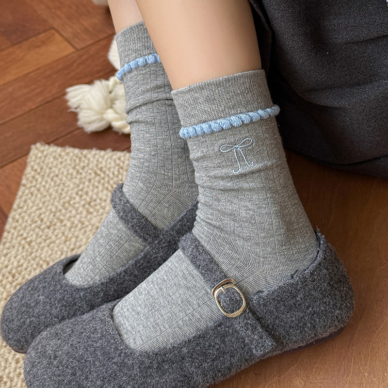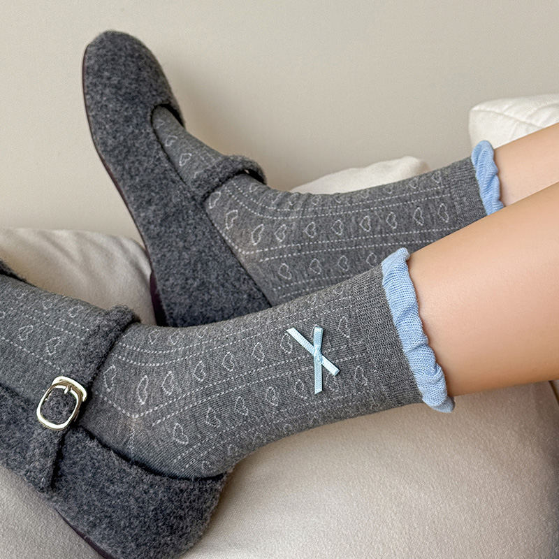 灰色蝴蝶结条纹袜子女款 月子长袜爱心 春秋纯色中筒棉袜2025新爆款