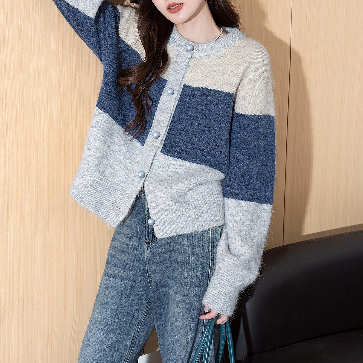 唐狮秋冬季 外套百搭tu 女毛衣慵懒风温柔宽条纹设计圆领开衫
