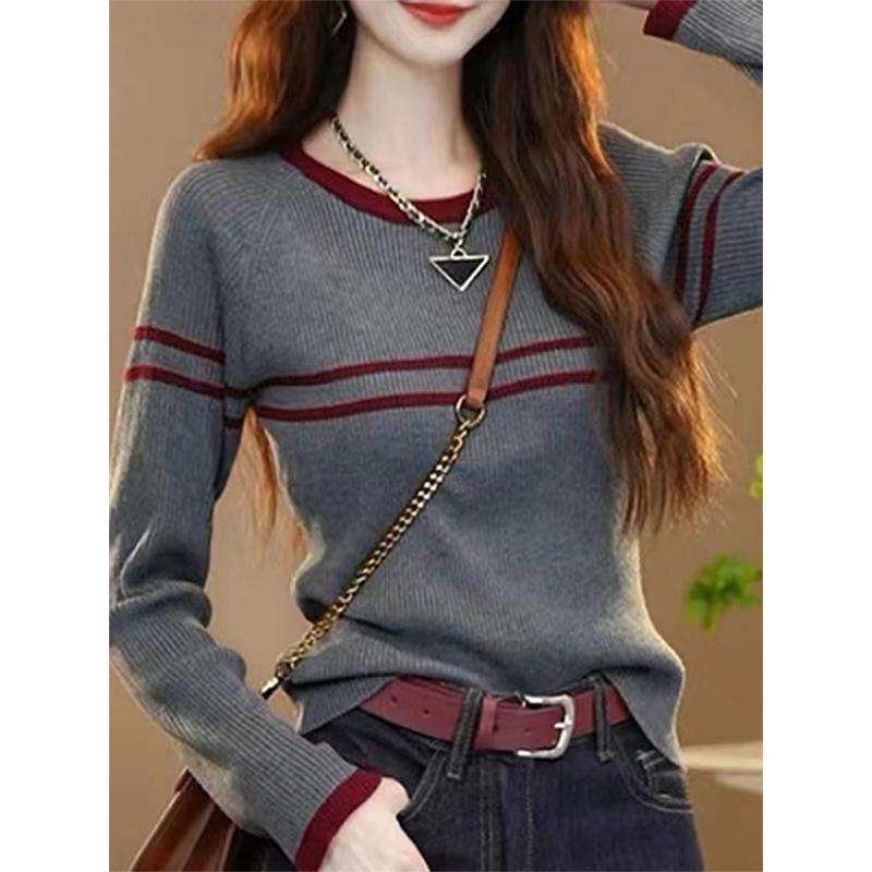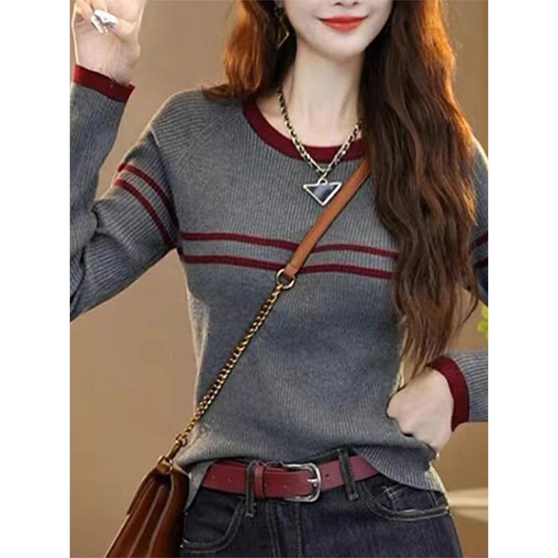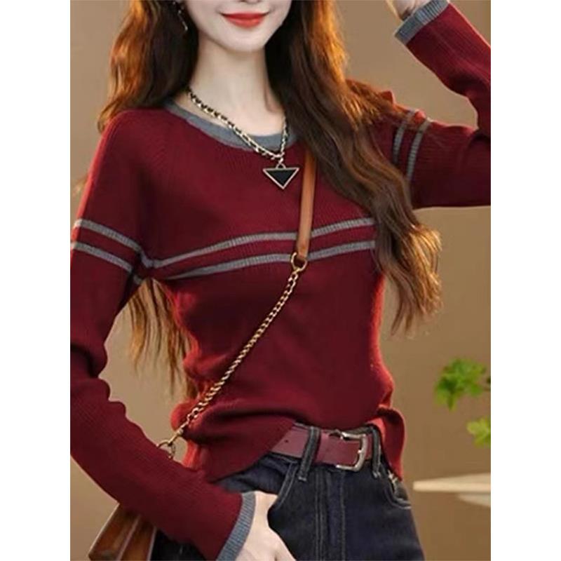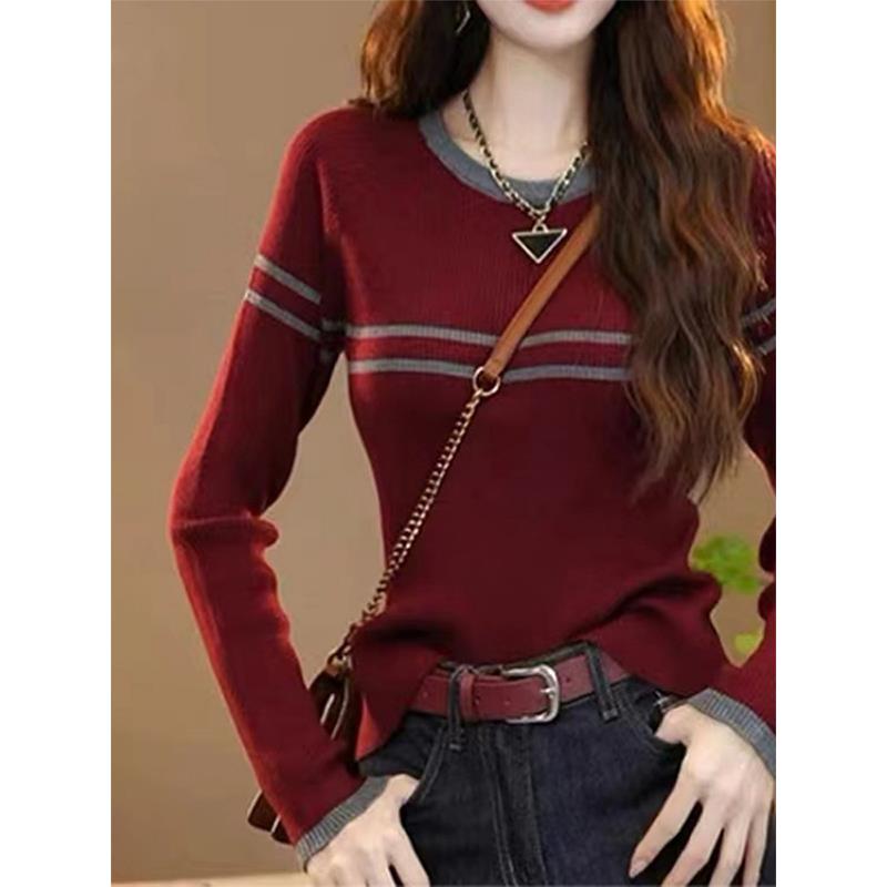 胖mm显瘦感打底上衣1009u 女2025新款 秋冬红色圆领条纹长袖 针织衫