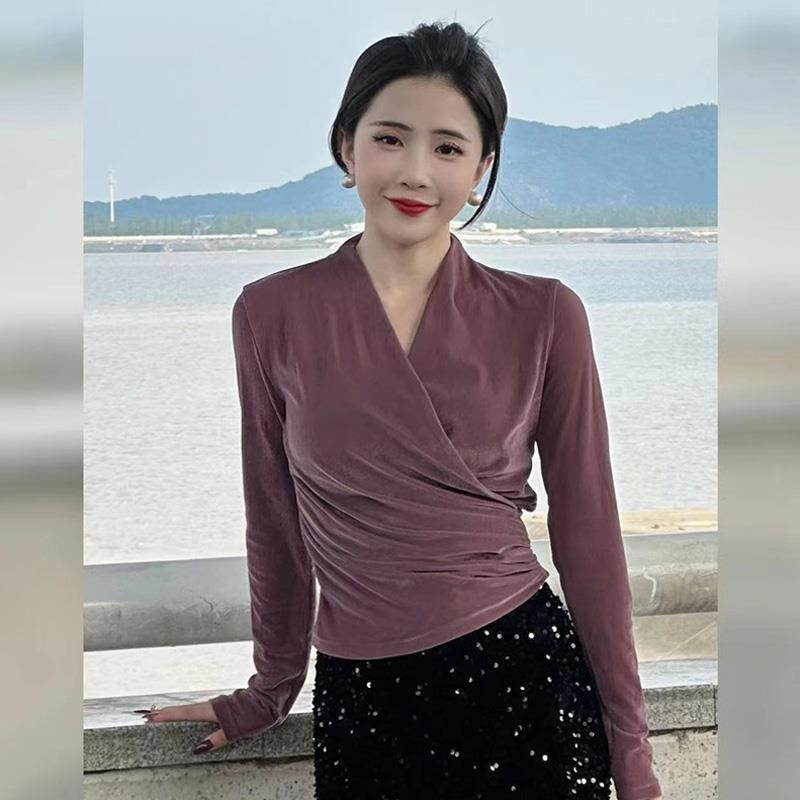 v领金丝绒上衣1010z 高贵洋气t恤泡泡袖 秋冬打底衫 女内搭2025新款