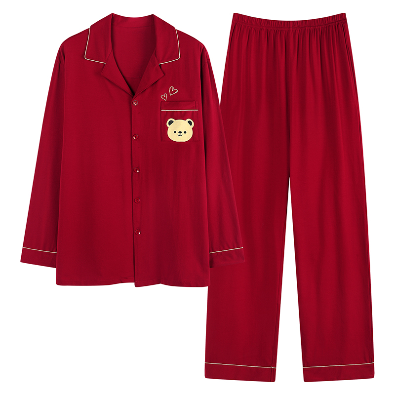 男春秋 带胸垫家居服套装 A类抗菌防螨纯棉情侣睡衣女长袖 红豆夏季