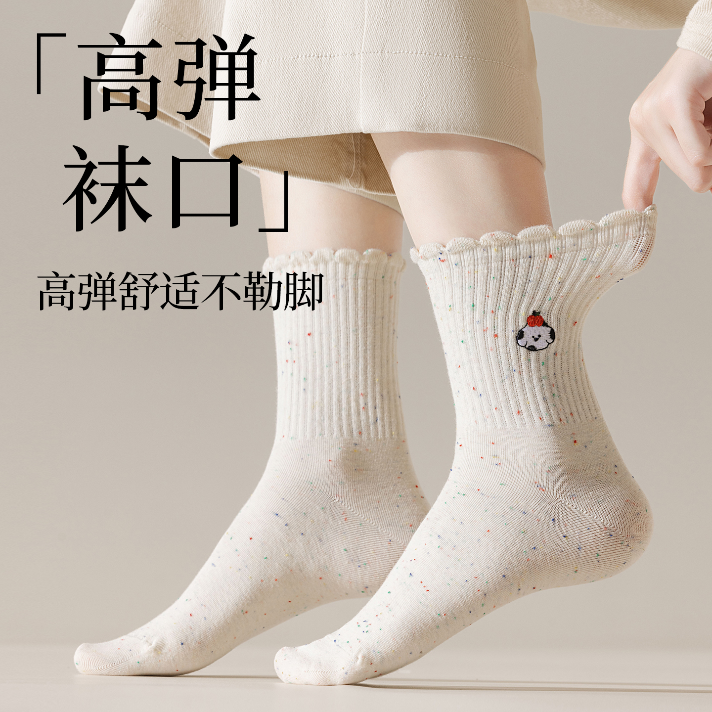 白色中筒女款 卡通可爱女生花边长袜 纯棉点子纱防臭刺绣女士秋冬季